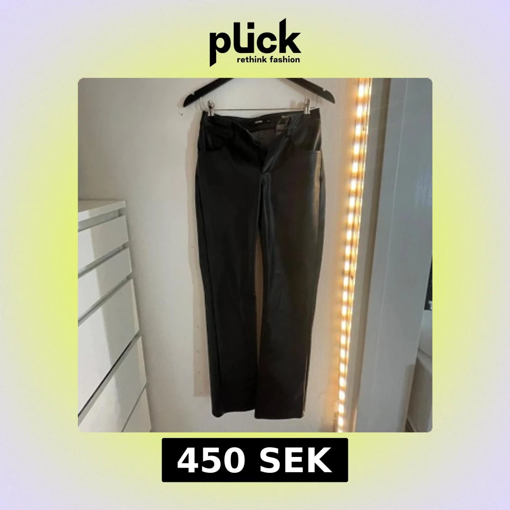 Snygga svarta byxor i skinnimitation från BikBok. De har en rak passform och hög midja med dragkedja fram. Perfekta för en trendig look.