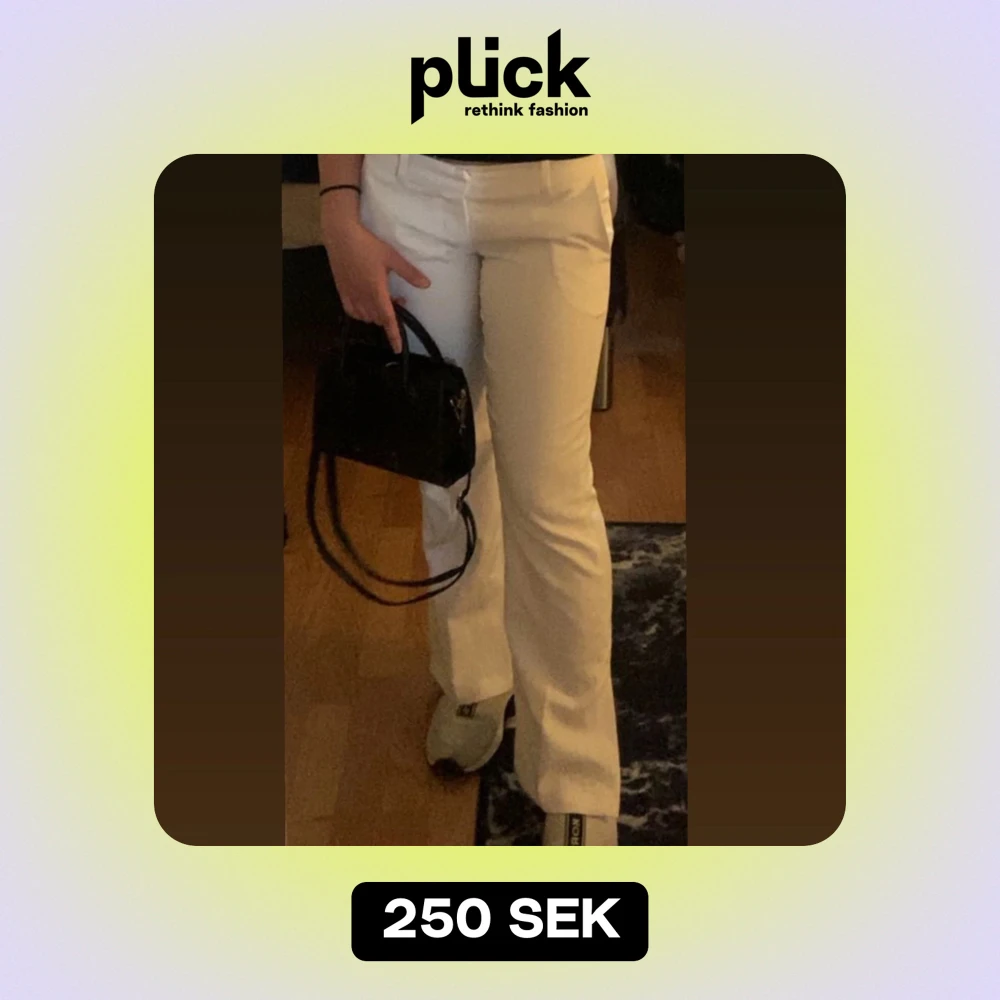 Säljer ett par snygga vita kostym byxor med bootcut-stil. De är perfekta för både vardag och fest. Byxorna har en låg midja och en stilren design som passar till det mesta. Perfekta för vår och sommar! Använda två gånger . Från bik bok