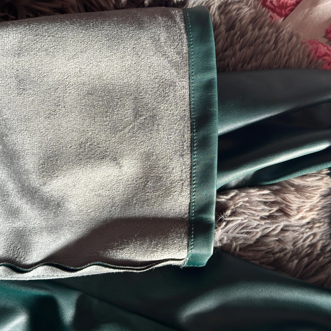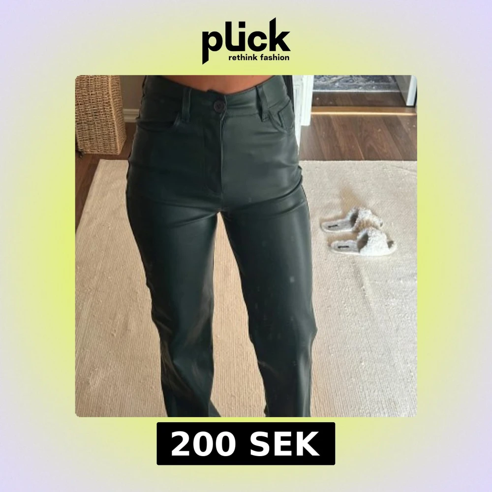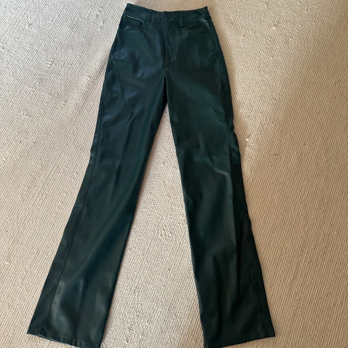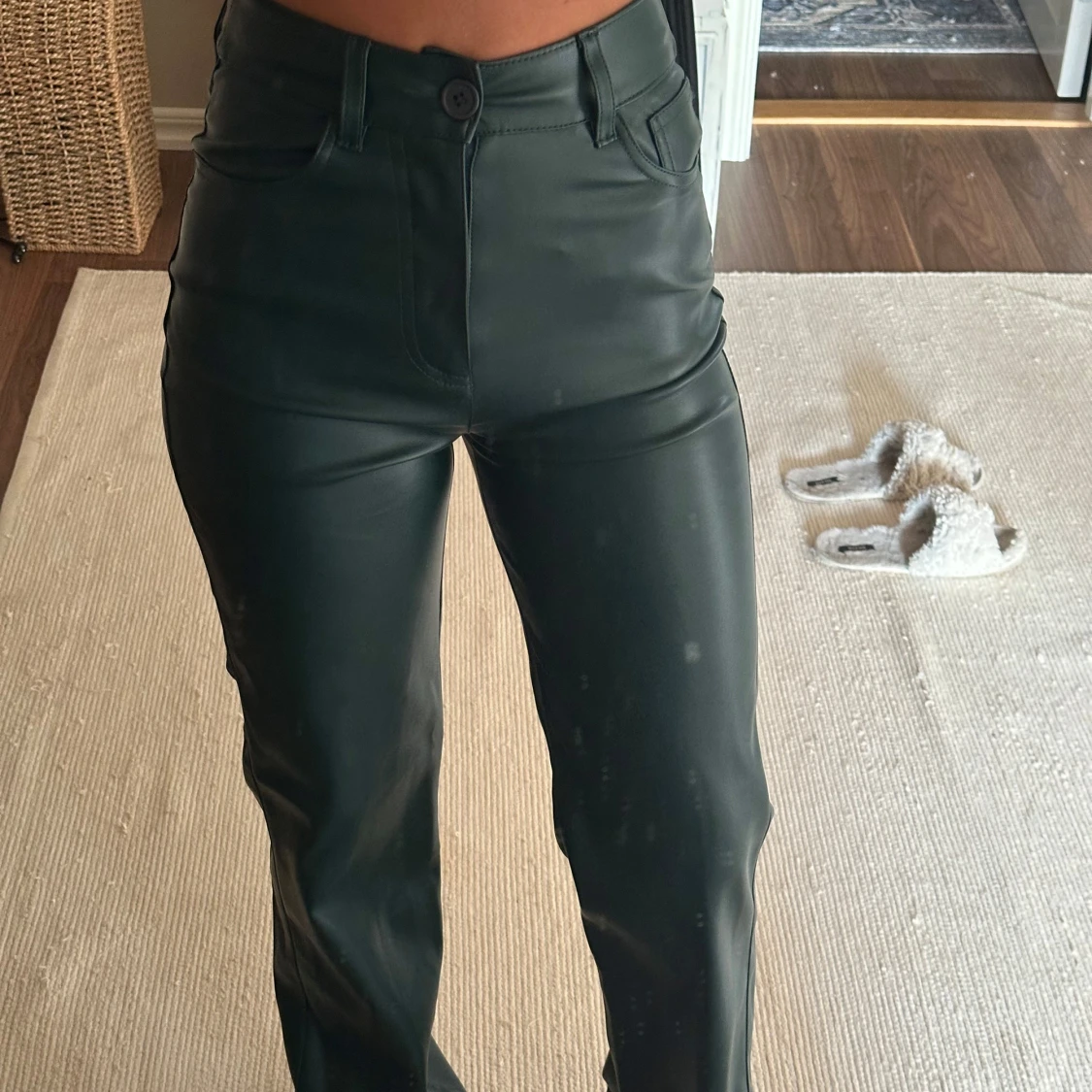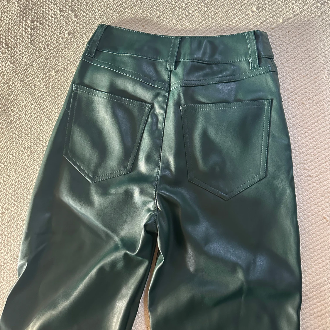 Snygga mörkgröna byxor i skinnimitation med raka ben och hög midja. Klassisk femficksmodell med bälteshällor och knappstängning. Perfekt nu till hösten