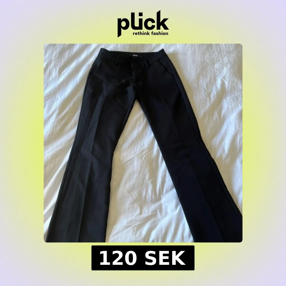 Svarta kostymbyxor från BikBok i klassisk rak modell med liten utsvängning längst ner, lågmidlade med pressveck och hällor för bälte. Byxorna har diskreta fickor fram och en fuskficka bak. Perfekta till en snygg och stilren look.