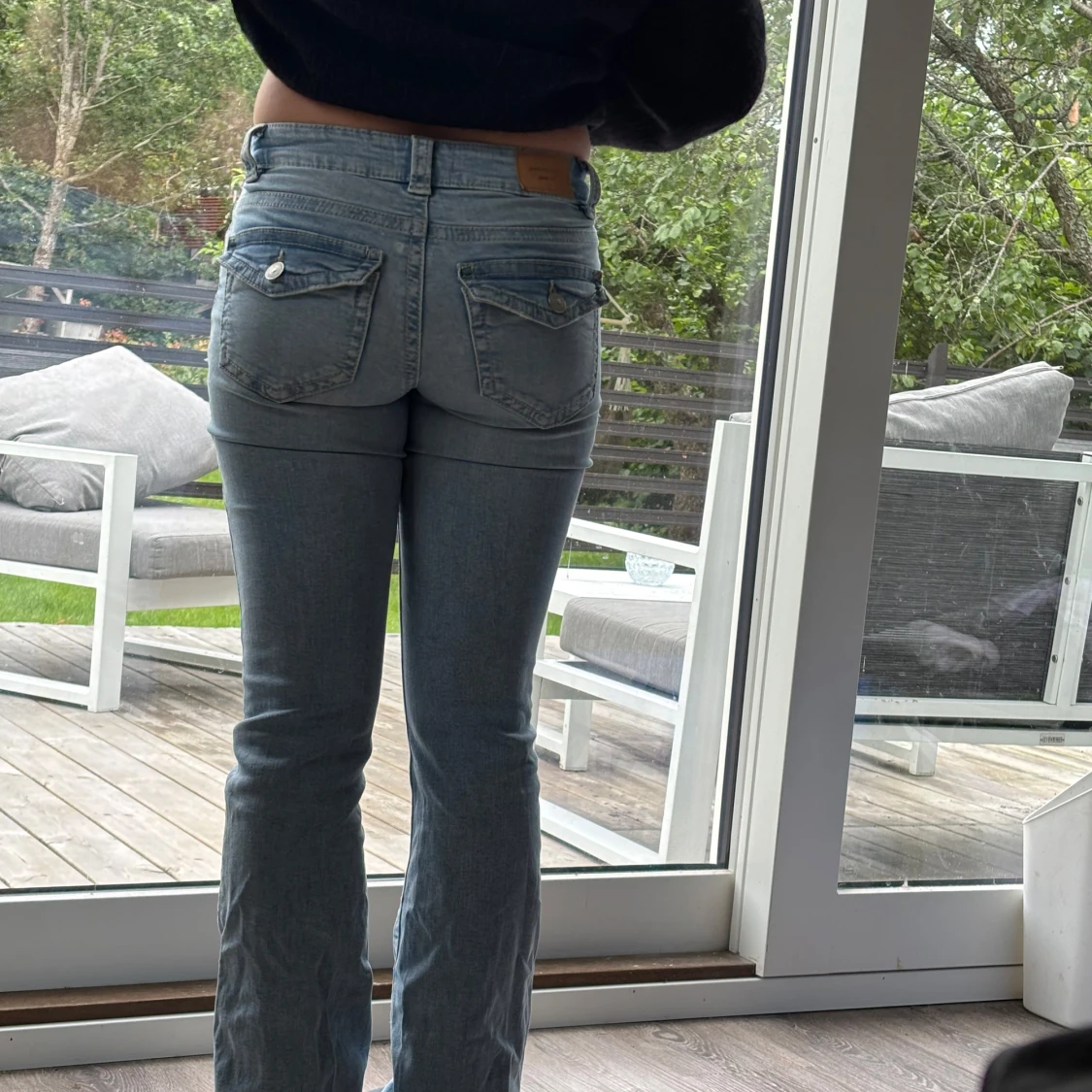 Snygga ljusblå jeans från bikbok med bootcut passform och coola fickor med knappdetaljer bak. Jeansen har låg midja och klassisk femficksdesign. Perfekta för dig som gillar en avslappnad men ändå trendig stil.