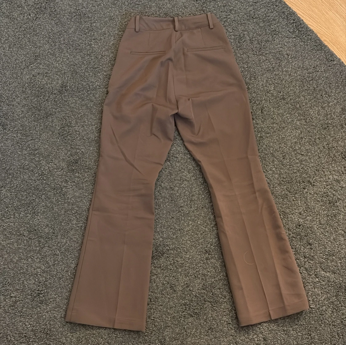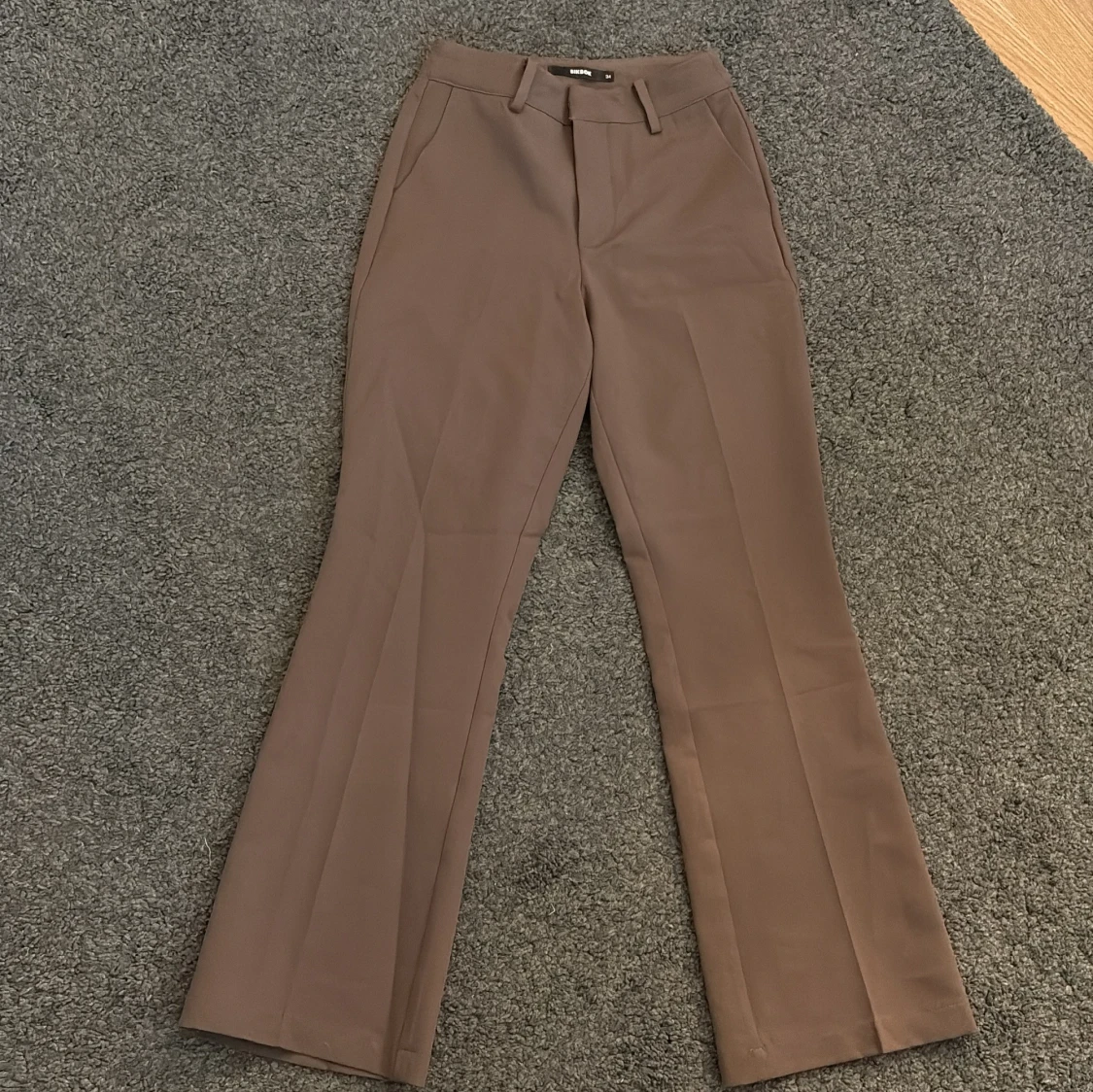 Snygga bruna kostymbyxor med bootcut-ben och hög midja. Byxorna har klassiska fickor fram, hällor för bälte och stängs med dragkedja och knapp. Perfekta för en clean och stilren look. Fick inte till baksidan så snyggt. Jag är också 1,55 cm perfekt längd och bara använts fåtal gånger.