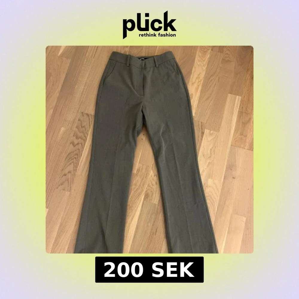 Grå kostymbyxor med bootcut och pressveck. Mjukt och bekvämt material. Medel/låg midja.