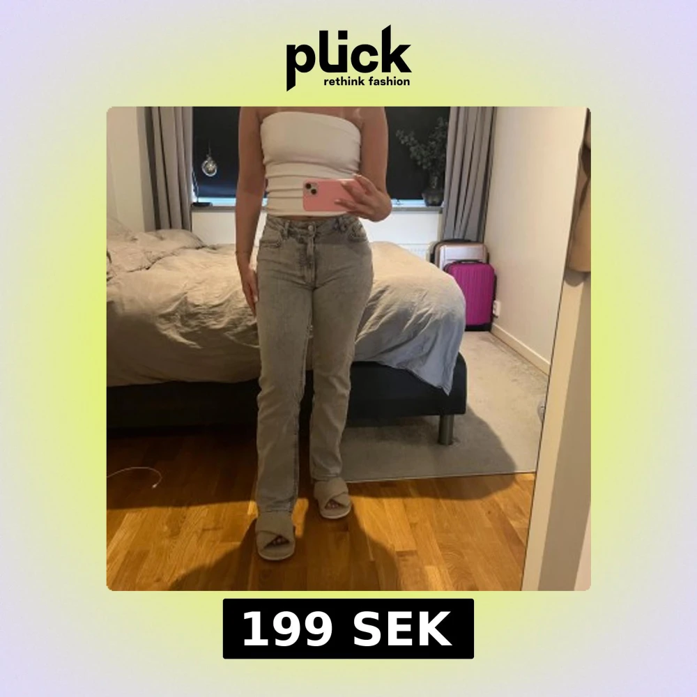 Säljer ett par ljusgrå jeans med rak passform och medel hög midja. Jeansen har klassisk femficksdesign, knapp och dragkedja framtill. Perfekt för dig som gillar en enkel och stilren look.
