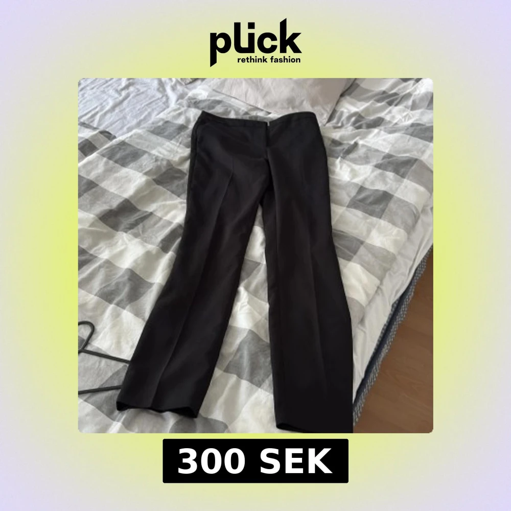 Säljer ett par svarta kostymbyxor från BikBok i klassisk rak modell. Byxorna har pressveck framtill, stängs med dragkedja och knappar i midjan. Perfekta för en stilren look. Lågmidjade