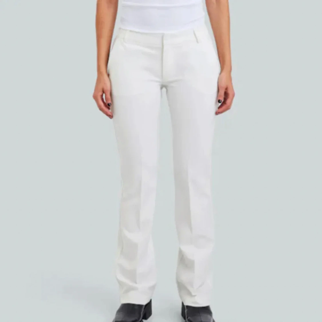 Vita lågmidjade kostym byxor från bikbok, de har slits och är i strlk 38, har använts 2 gånger, uppklippta 1-2cm kortare.