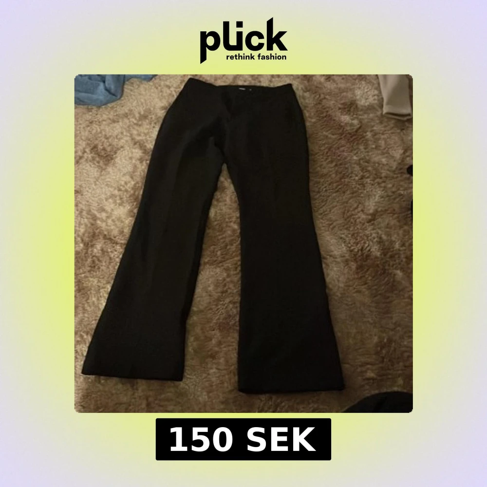 Svarta kostymbyxor med lite utsvängt silhuett och låg midja . Byxorna har en klassisk och stilren look, perfekta för dig som gillar en tidlös vibe. Materialet är troligtvis polyester eller bomullsmix, vilket ger en snygg passform och lite stretch.