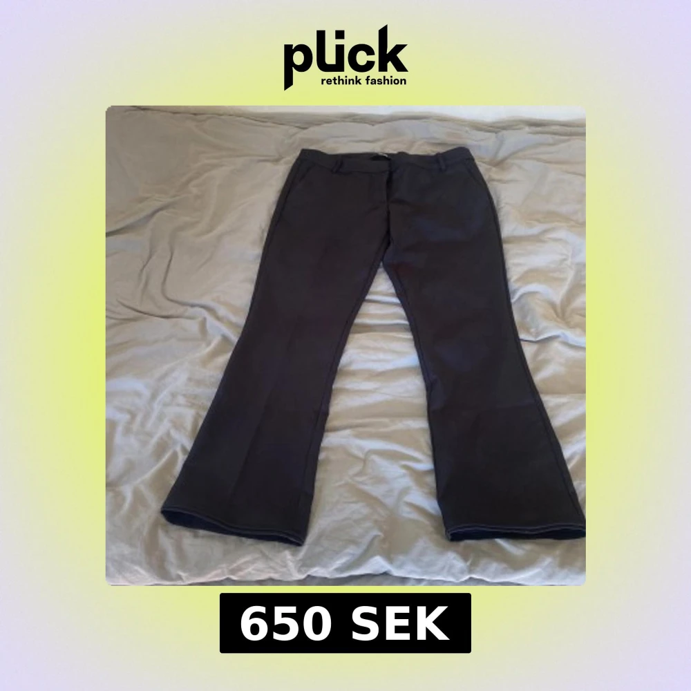 Snygga svarta kostymbyxor med bootcut-snitt och klassiska pressveck. Byxorna har hällor för bälte och stängs med dragkedja . Perfekta för en clean och stilren look. Materialet känns mjukt och följsamt. Har sytt upp 3 cm. De passar perfekt för mig och jag är 160.