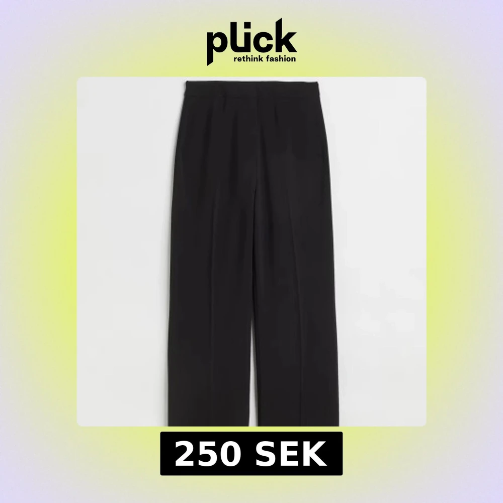 Stilrena svarta kostymbyxor med hög midja och vida ben. Byxorna har pressveck, dold dragkedja och hake i midjan för en clean look. Perfekta till en snygg topp eller kavaj. Materialet är mjukt och faller snyggt.