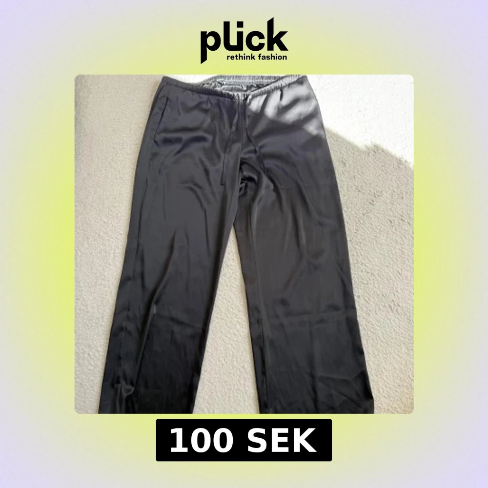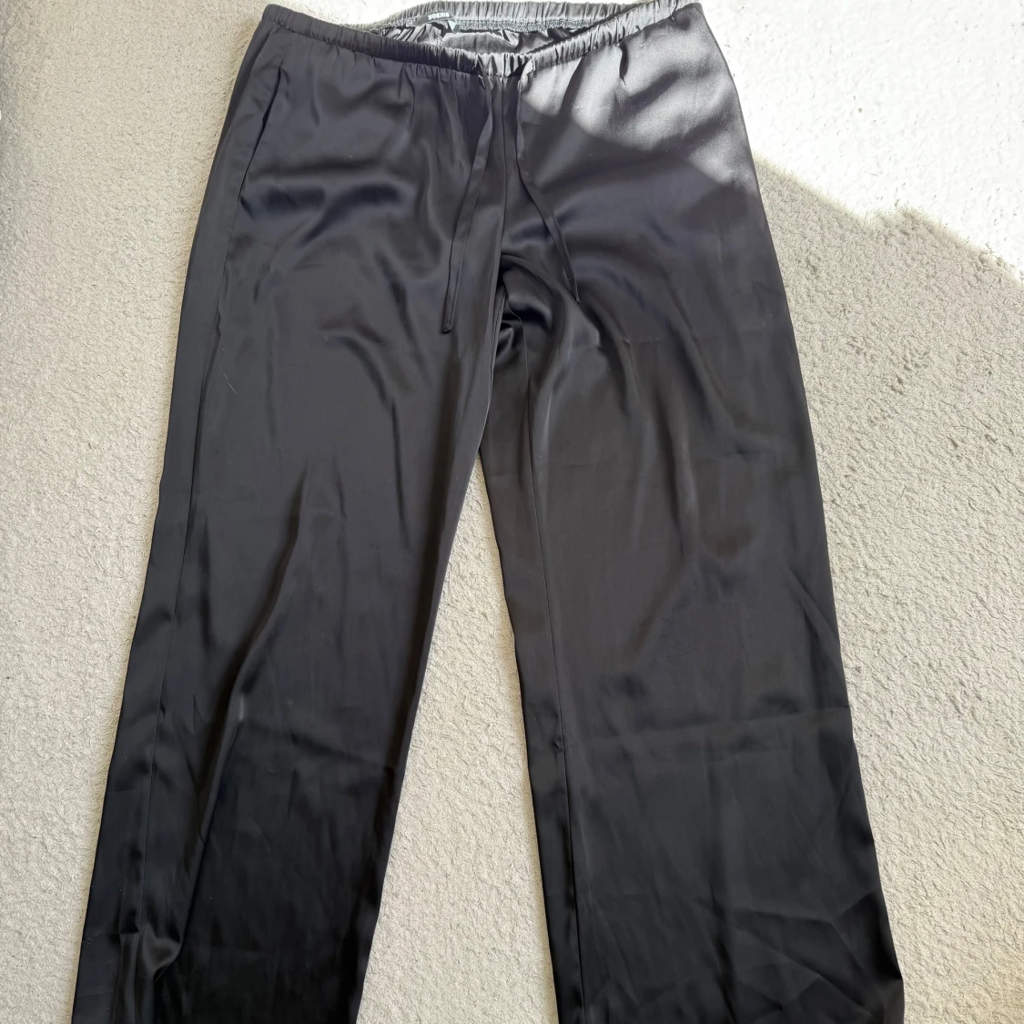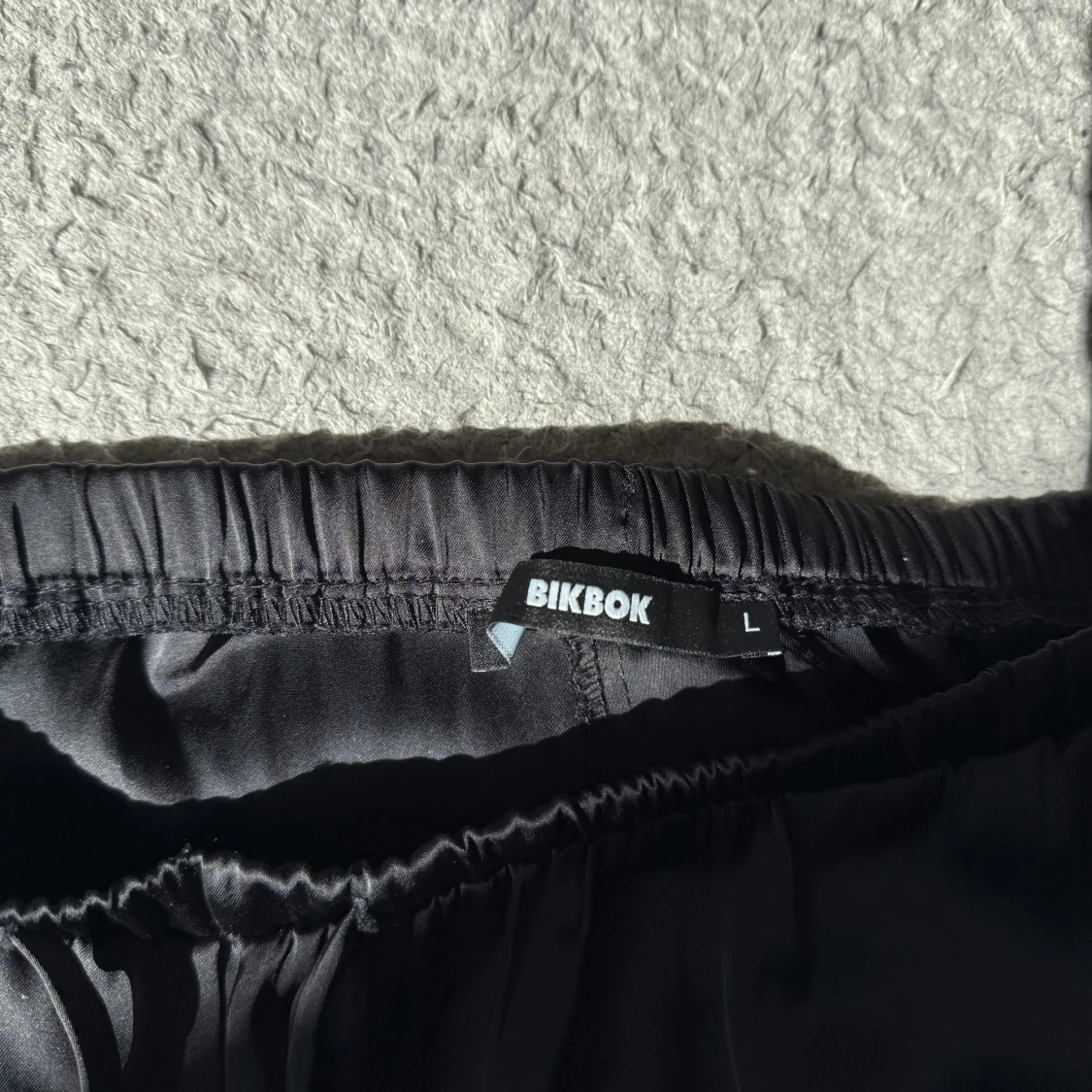 Snygga svarta byxor från BikBok i storlek L. De har en mjuk, glansig yta och resår i midjan med snörning.