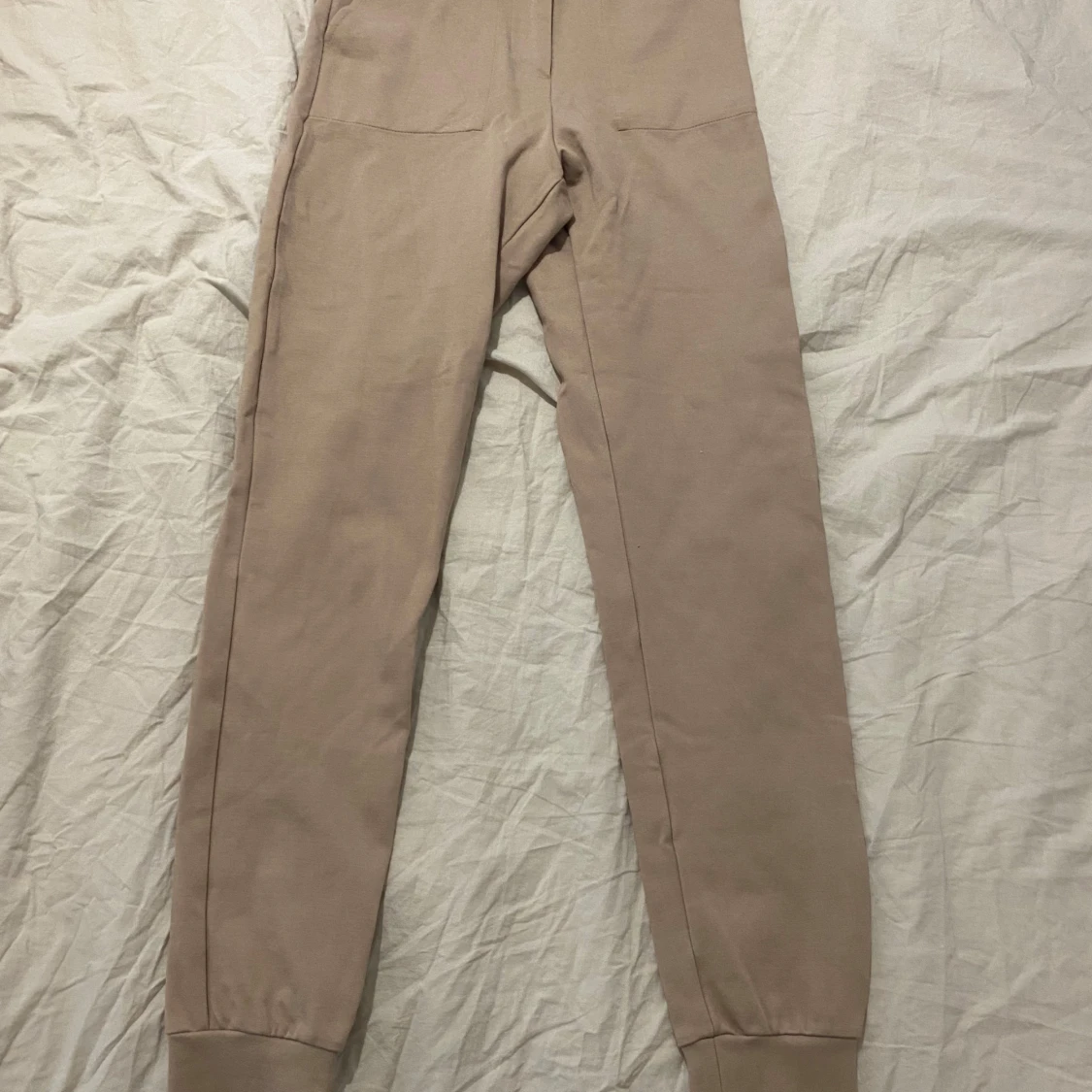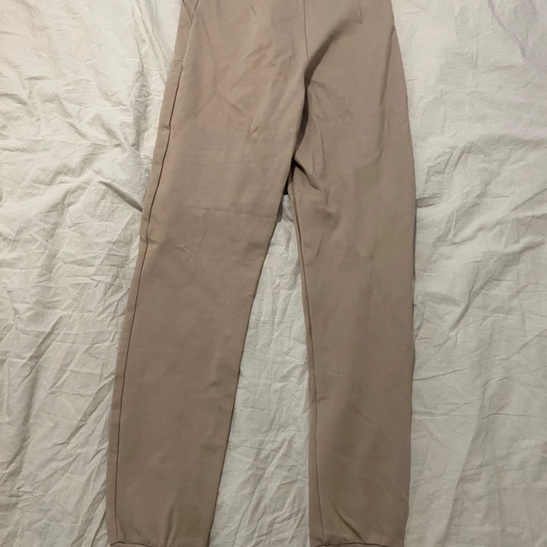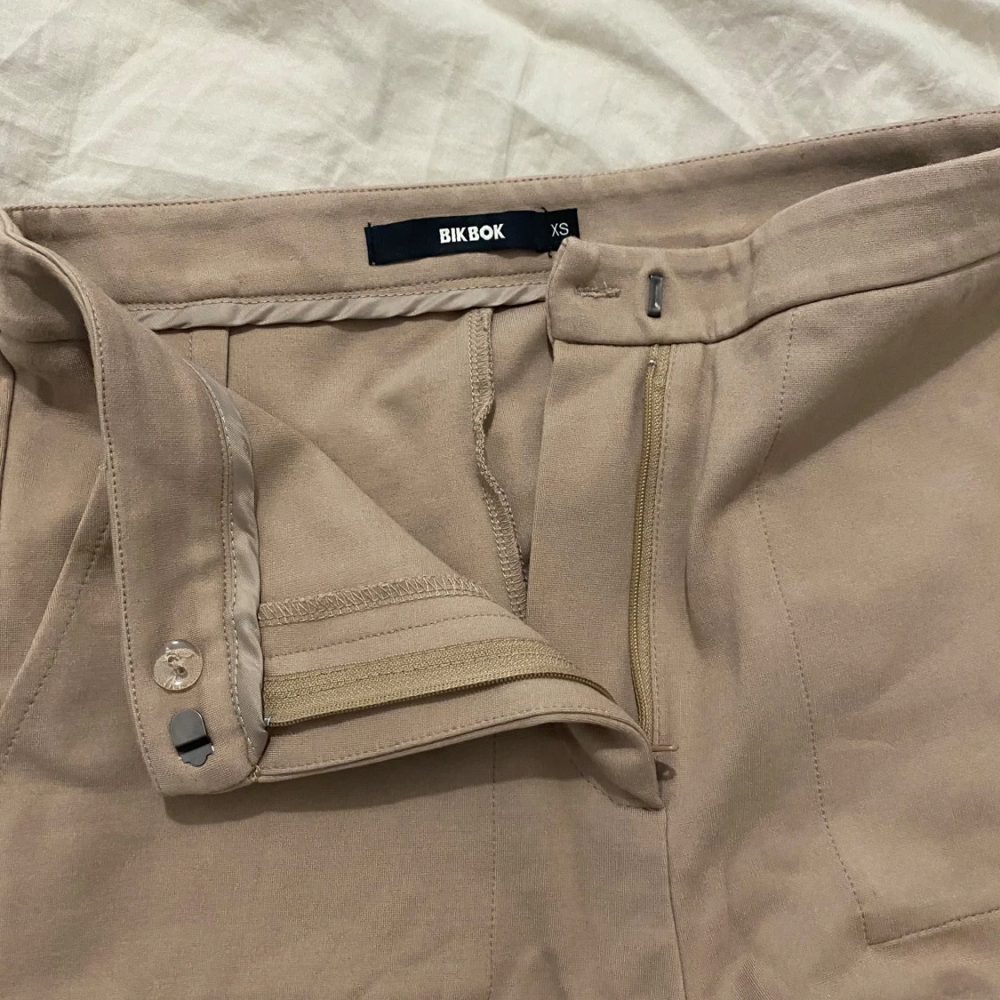 Snygga beiga mjukisbyxor från Bik Bok i storlek XS. Byxorna har resår vid bensluten, dragkedja och knapp framtill samt mjukt material som känns skönt mot huden. Perfekta för en chill och avslappnad look.