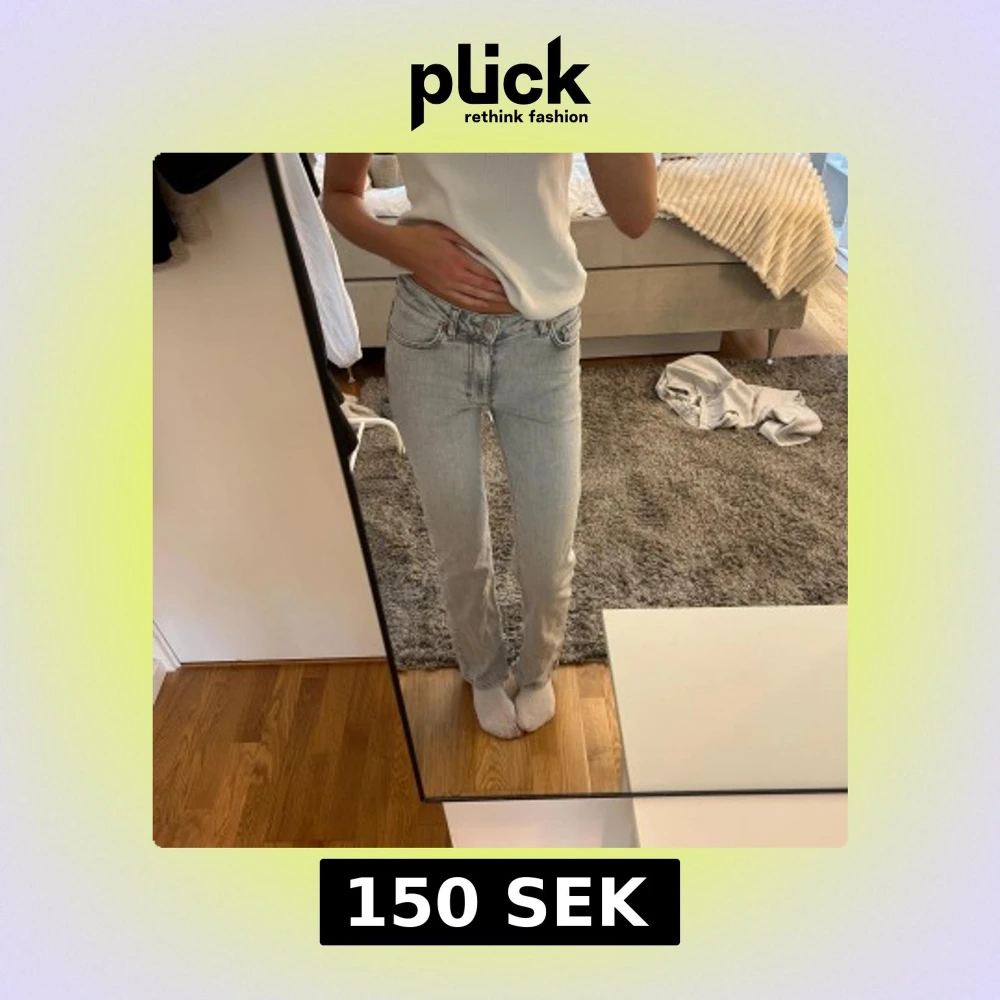 Säljer ett par ljusgrå jeans med rak passform och klassisk femficksdesign. Jeansen har låg midja och är tillverkade i mjukt denimtyg. Perfekta för en clean och stilren look.