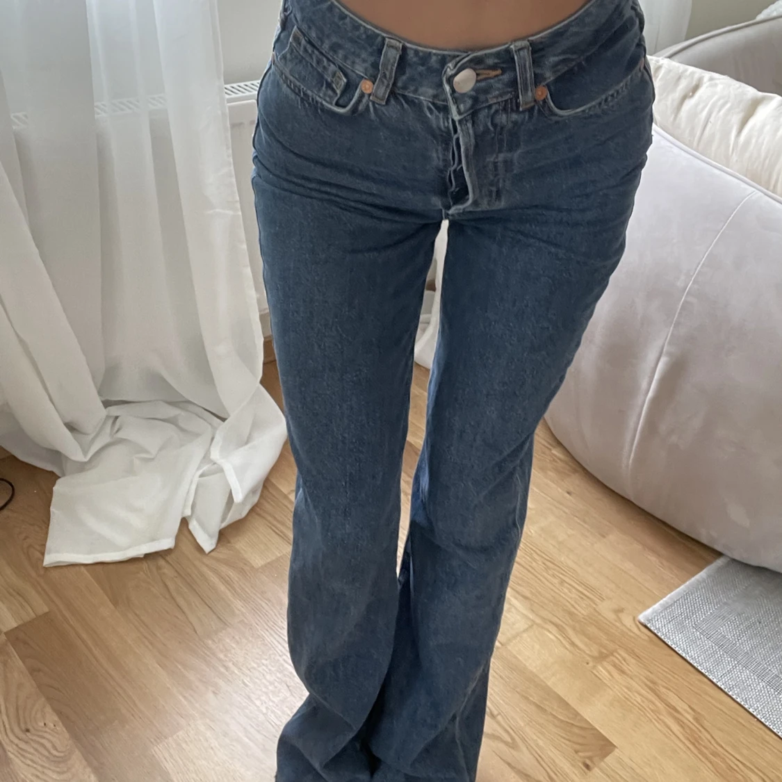 jeans från bikbok, avklippta längst ner pga för långa. passar mig som har xs o är 160! Nypris ca 499