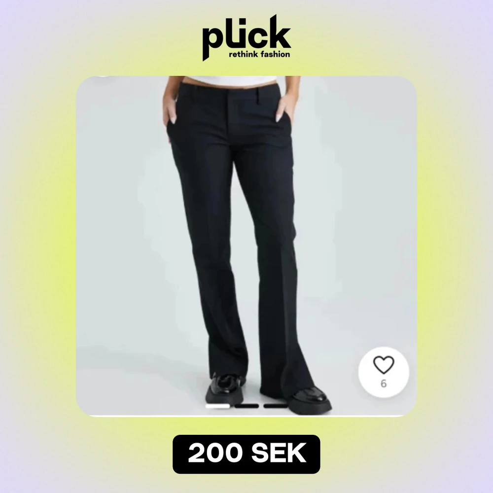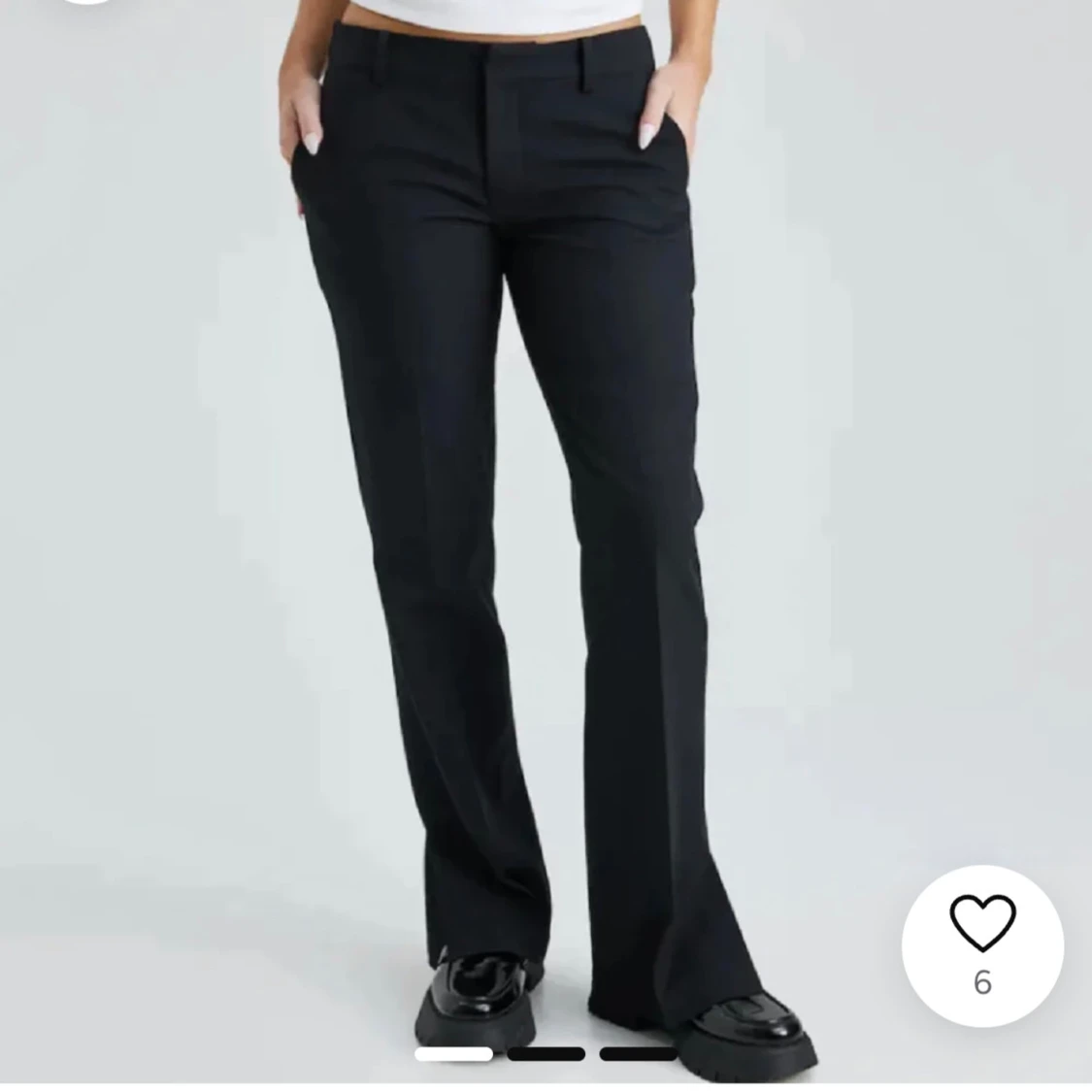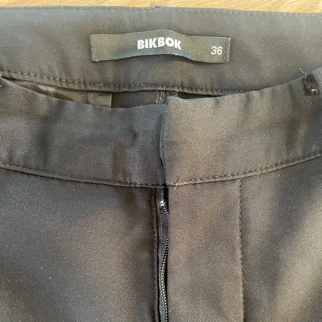 Säljer ett par svarta kostymbyxor från BikBok i storlek 36. Byxorna har en låg midja och bootcut. De är tillverkade i ett bekvämt och slitstarkt material, perfekt för både vardag och fest. Byxorna är i nyskick