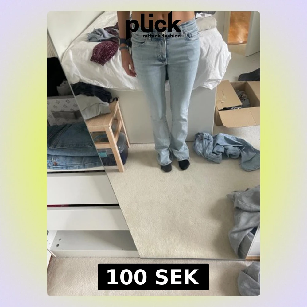 Säljer ett par ljusblå low flare jeans med låg midja och klassisk femficksdesign. Jeansen har en snygg utsvängd passform nedtill och är tillverkade i mjukt denimtyg.