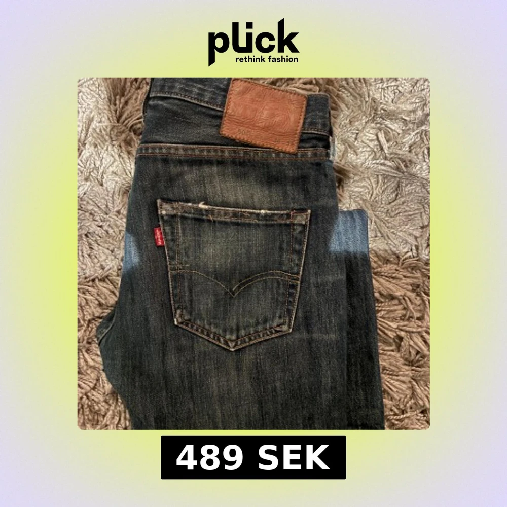 Säljer ett par klassiska Levi's 501 jeans i mörkblå tvätt med snygga slitningar. Modellen har raka ben, fem fickor och den ikoniska läderpatchen bak i midjan. Jeansen har orange kontrastsömmar och är tillverkade i robust denim.