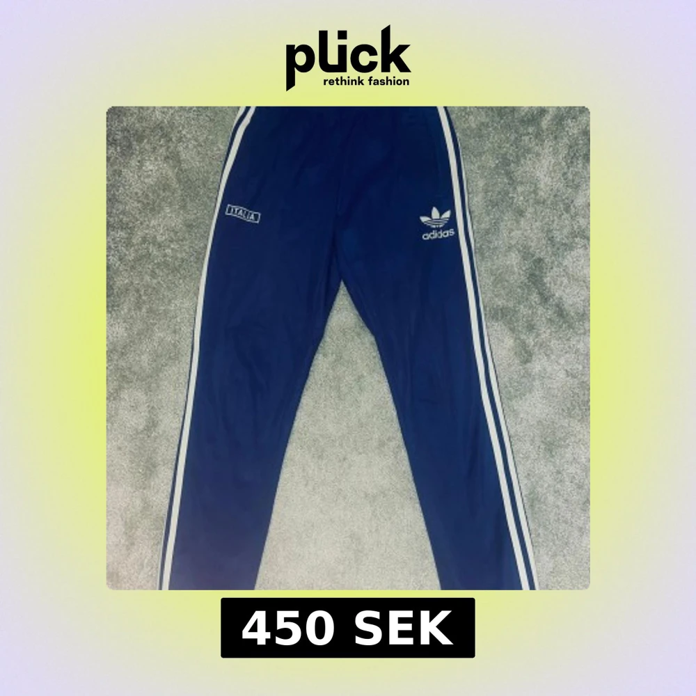 Snygga blå byxor från Adidas med vita ränder längs sidorna och broderad Adidas-logga samt 'Italia' på ena benet. Byxorna har elastisk midja och är tillverkade i ett glansigt syntetmaterial. Perfekta för sköna outfits. Kan gå ner i pris. Sällsynta❗️