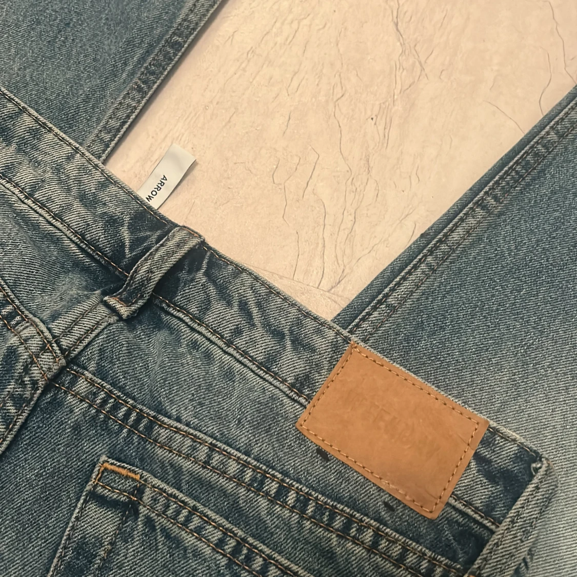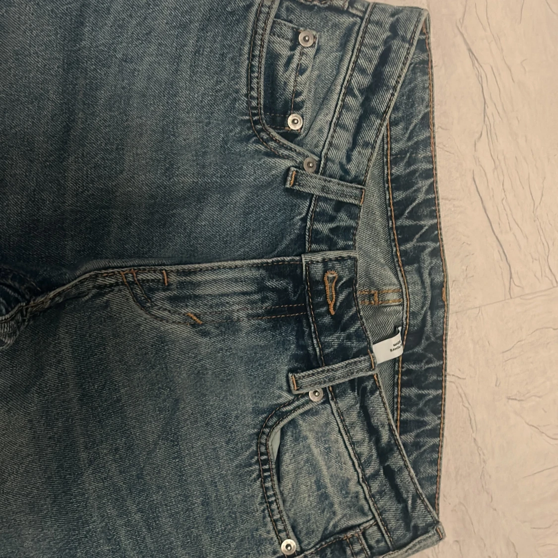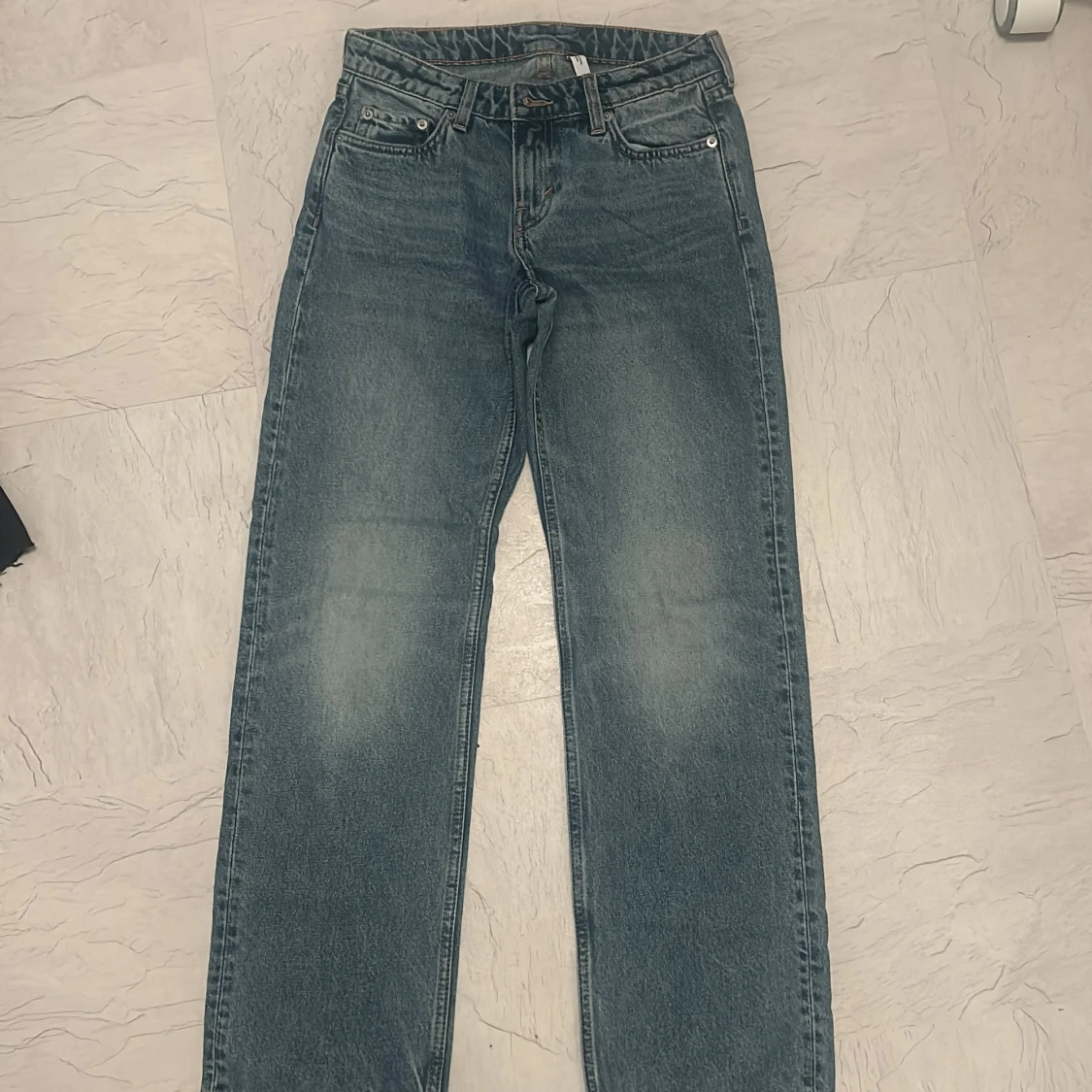 Klassiska blå jeans från weekday med raka ben (arrow modell) . Jeansen har en mellanblå tvätt med lätt slitning och kontrastsömmar. Tillverkade i robust denim med normal passform och medelhög midja. Perfekta för en avslappnad och stilren look. Helt nya, low waist sitter jätte fina men är tyvärr för små på mig, STORLEK w25 L30