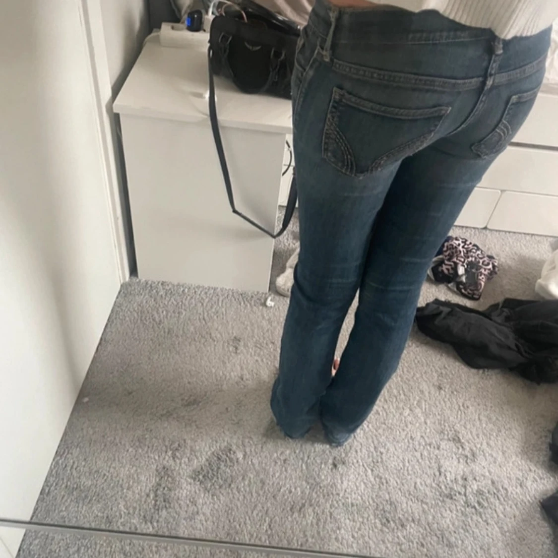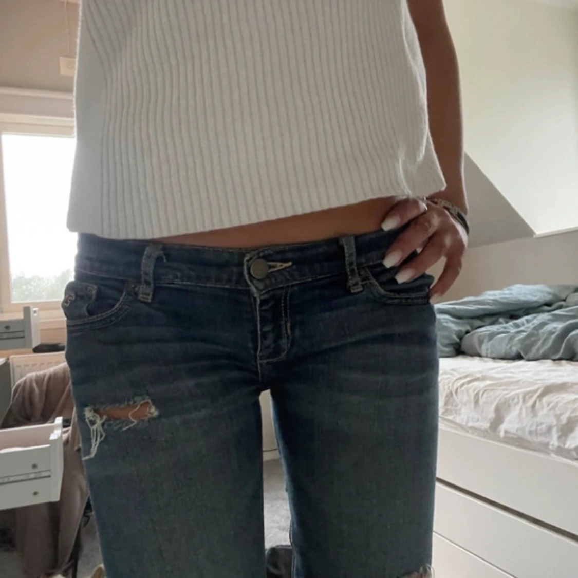 Blå bootcut hollister jeans med slitningar