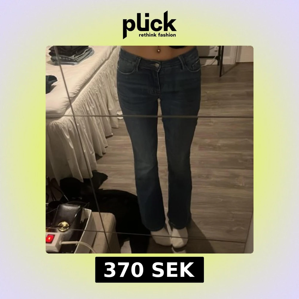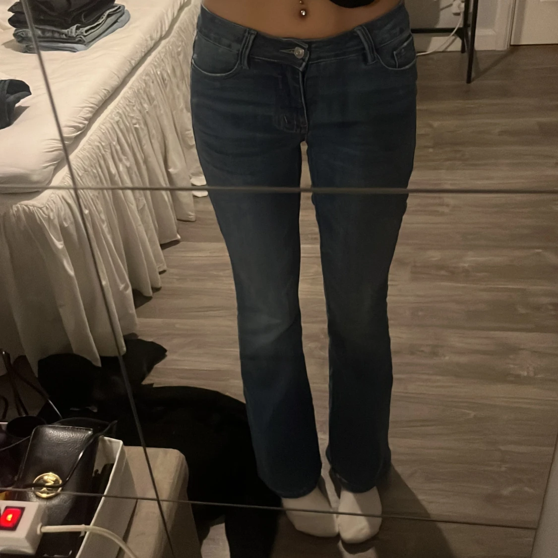 Snygga blå bootcut jeans med låg midja. Väldigt skönt material men tyvärr förstora för mig