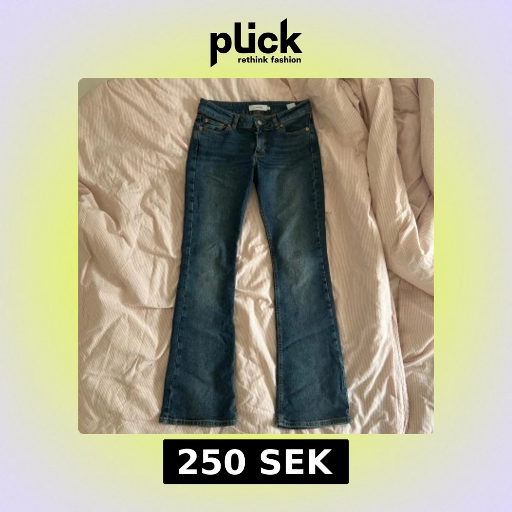 Säljer ett par klassiska blå bootcut jeans med fem fickor och orangea sömmar. Jeansen har normal passform och är tillverkade i ett tåligt denimtyg. Perfekta för dig som gillar en tidlös stil med lite utsvängda ben.