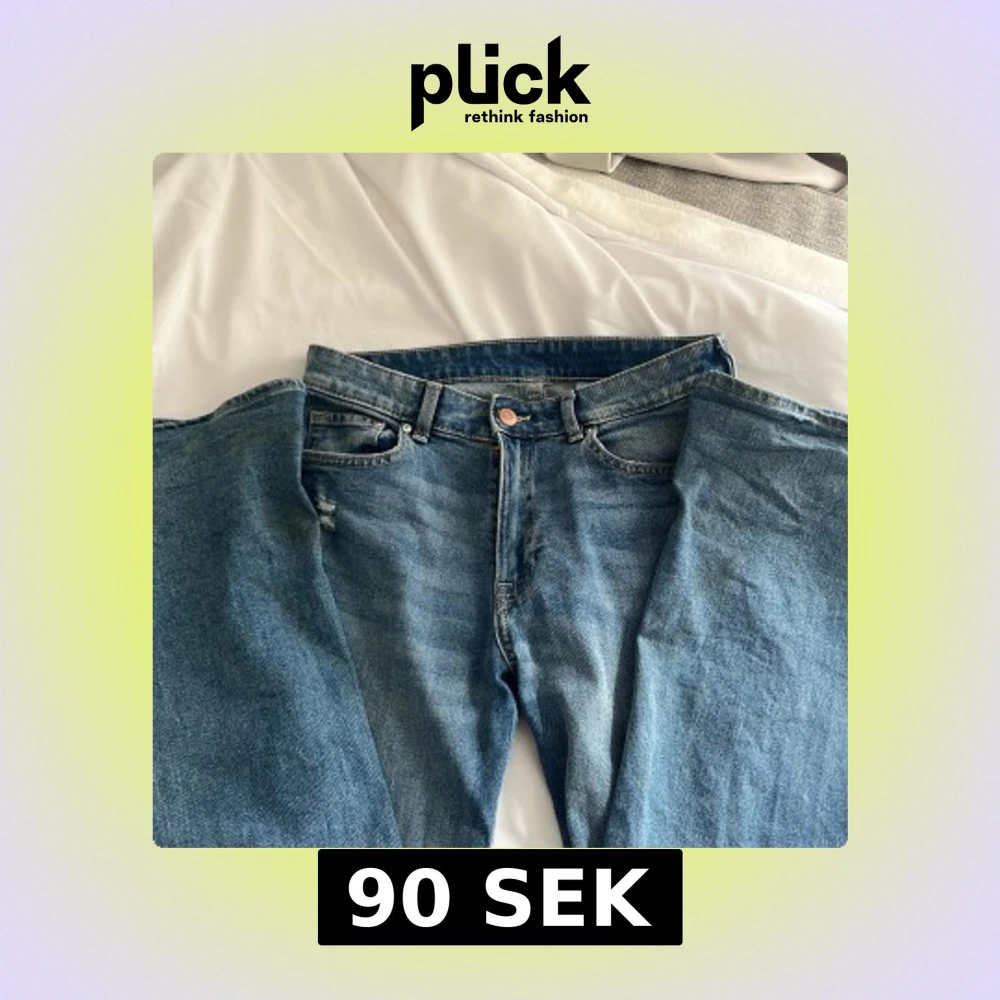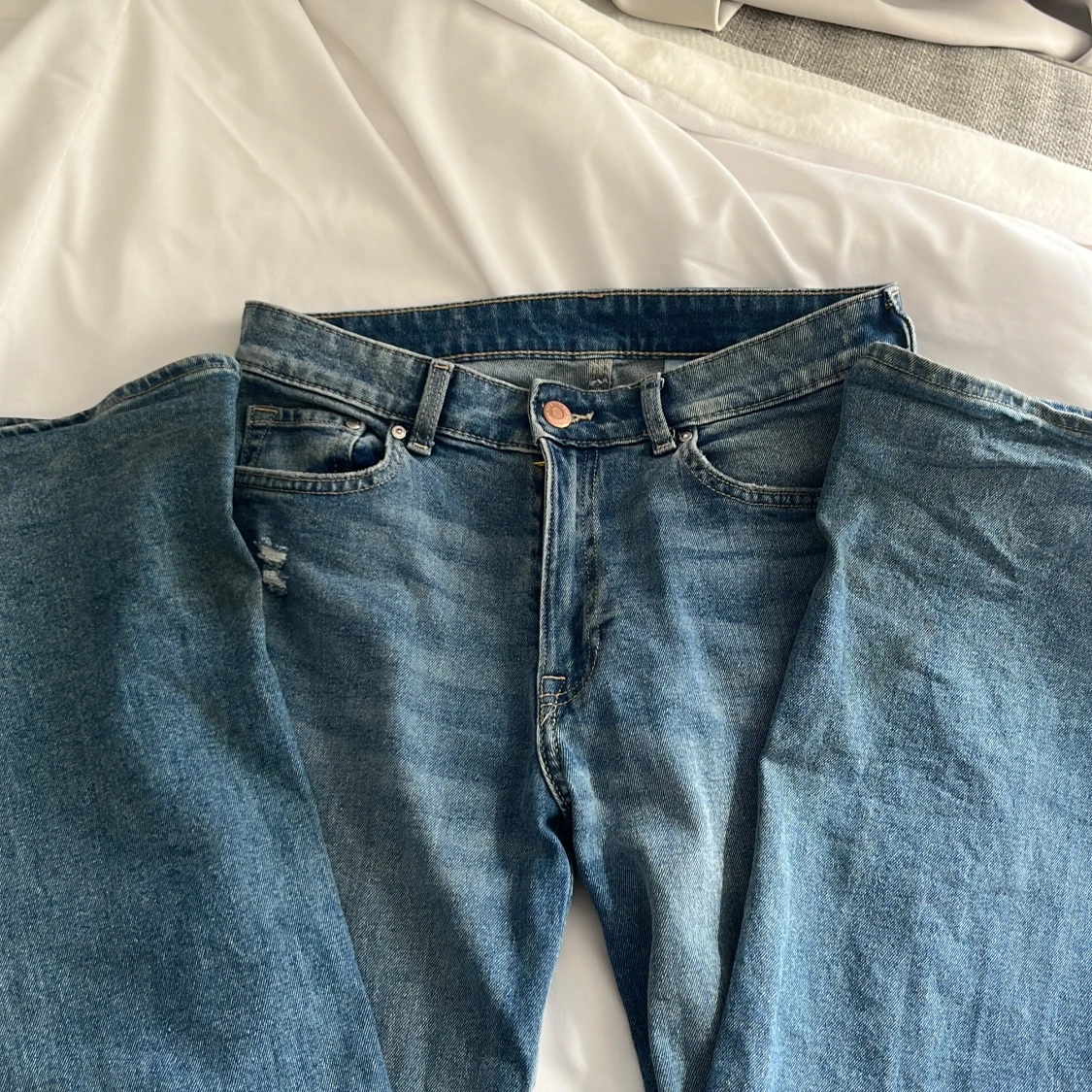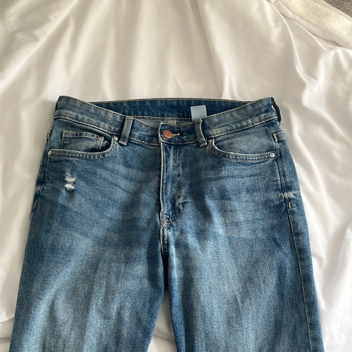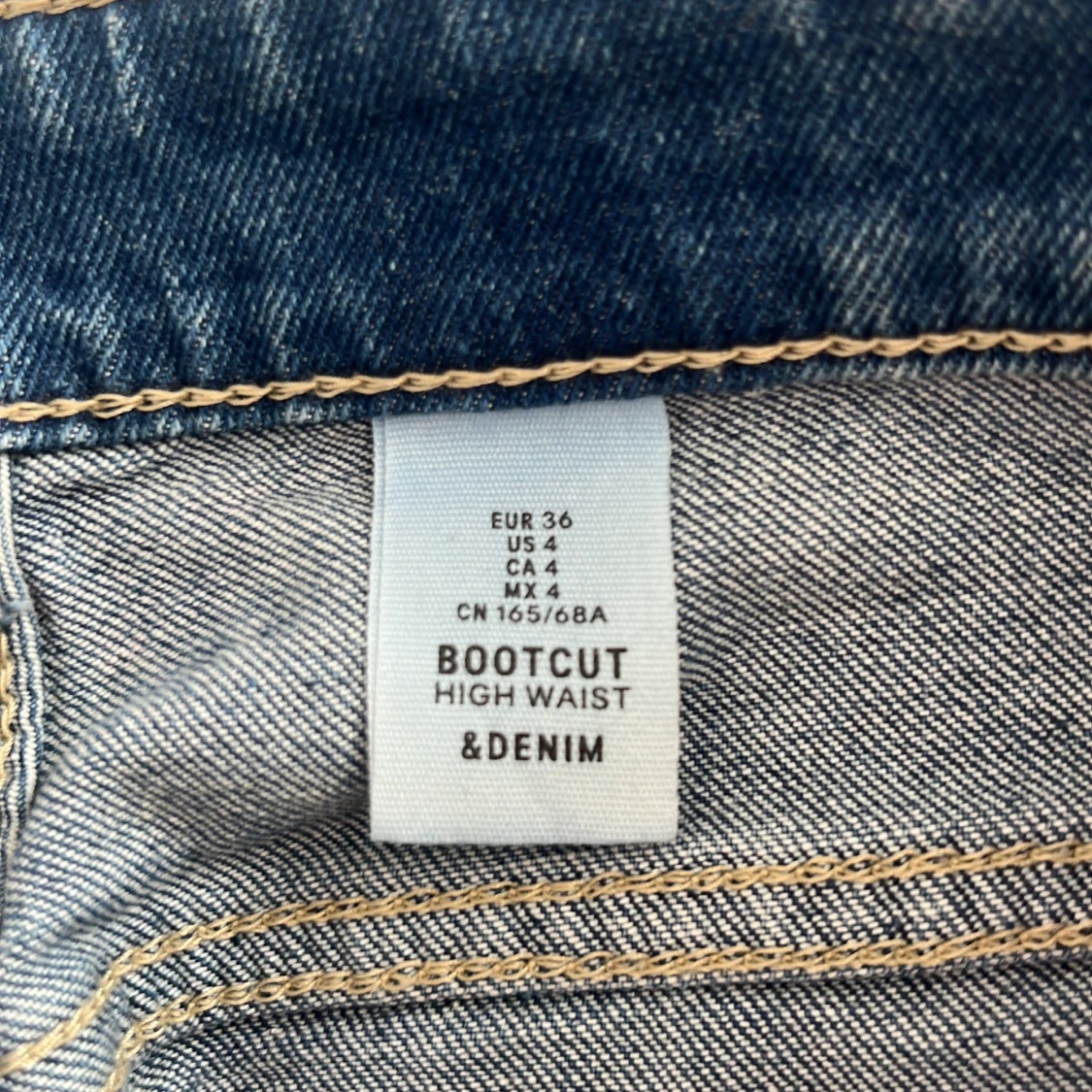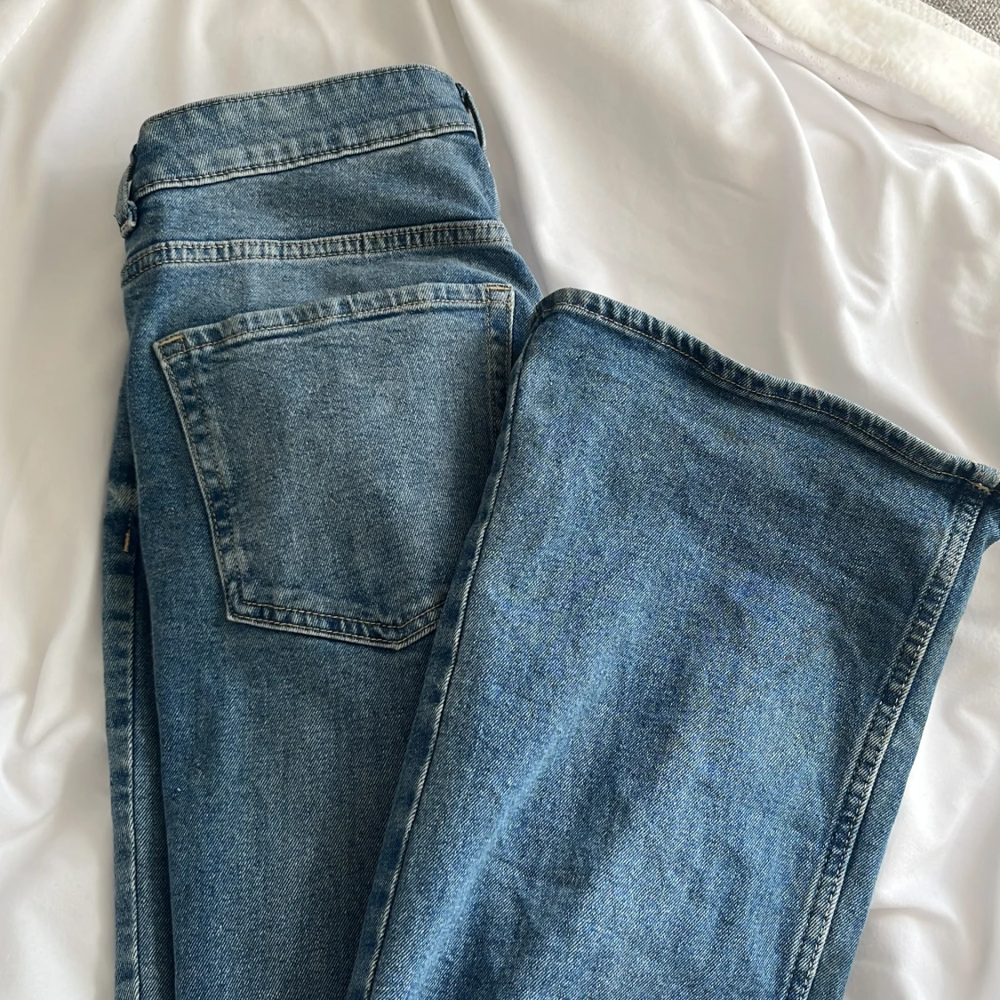 Säljer ett par snygga blå bootcut jeans med hög midja. Jeansen har en klassisk femficksdesign. Perfekta för en avslappnad stil.