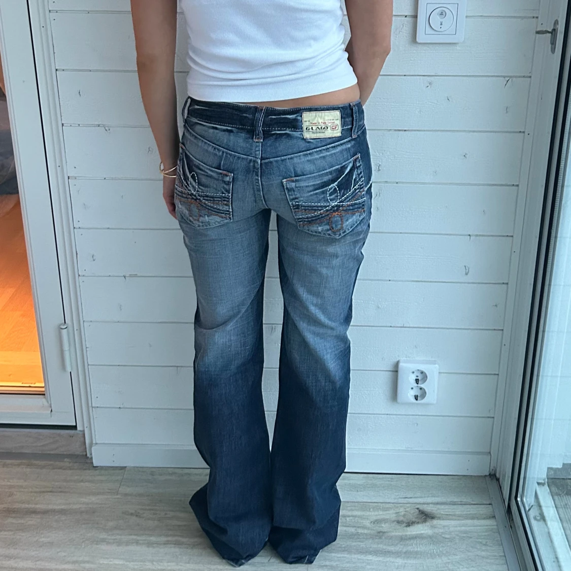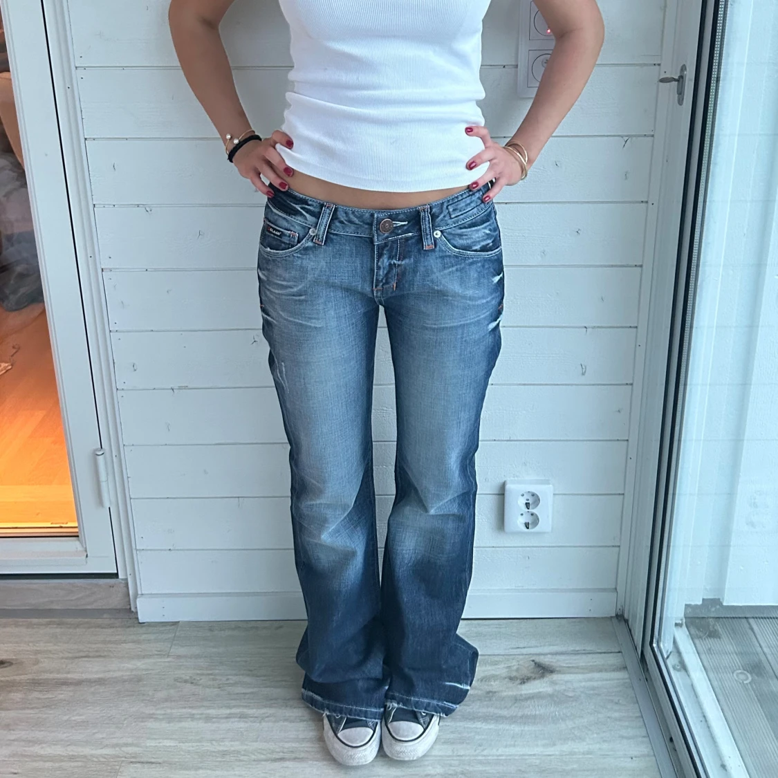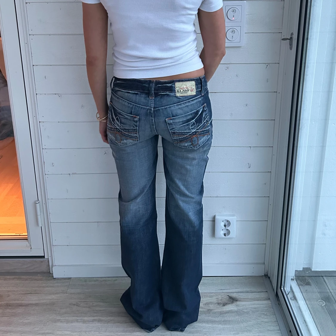 Blå bootcutjeans i unik tvätt och coola bakfickor. Storlek XS-S, Midja: 37x2 cm innerben: 86 cm