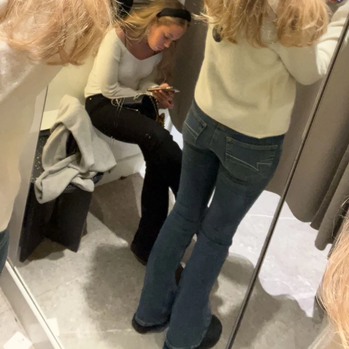Säljer ett par klassiska jeans i blå tvätt med bootcut passform. Jeansen har låg midja, fem fickor och snygga kontrastsömmar. Materialet är slitstarkt denim i bomull och de har dragkedja och knapp framtill. Perfekta för dig som gillar retrovibbar och tidlös stil.