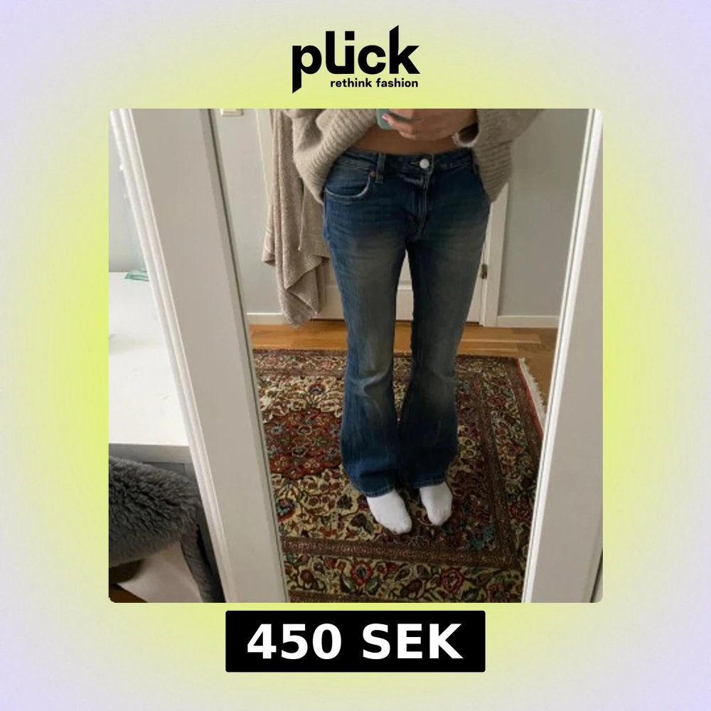 Snygga blå bootcut jeans från weekday i modellen flame. De har en lätt tvättad look och är perfekta för en avslappnad stil. Byxorna är nästan helt oanvända och ser som nya ut! Nypris 590kr, w28 L34