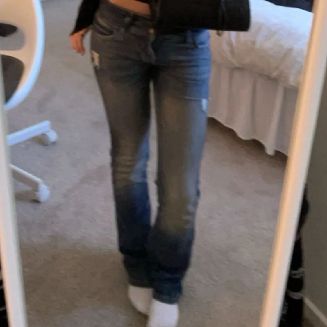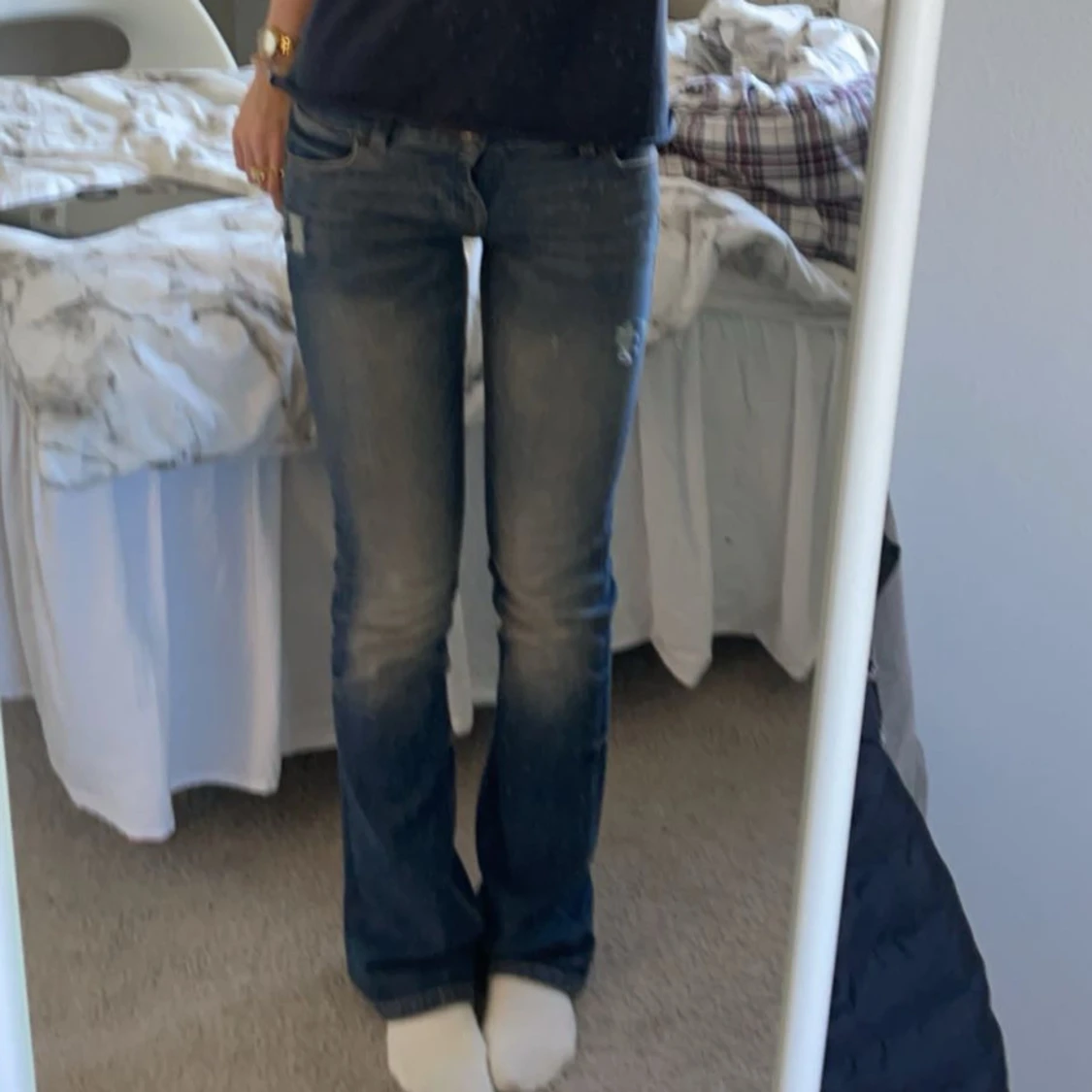 Snygga blå bootcut jeans med en klassisk femficksdesign. De har en lätt slitning på låren och knäna för en trendig look. Perfekta för en avslappnad stil. Gjort hålen själv.