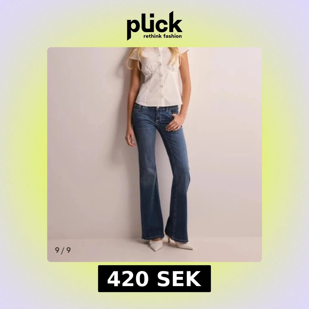 Snygga blå bootcut jeans med klassisk femficksdesign och dekorativa sömmar på bakfickorna. Bra skick, knappt använda. Skriv för mer bilder!