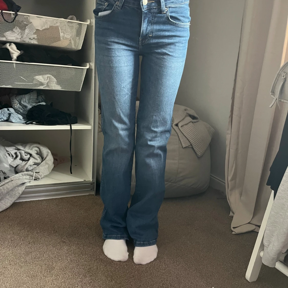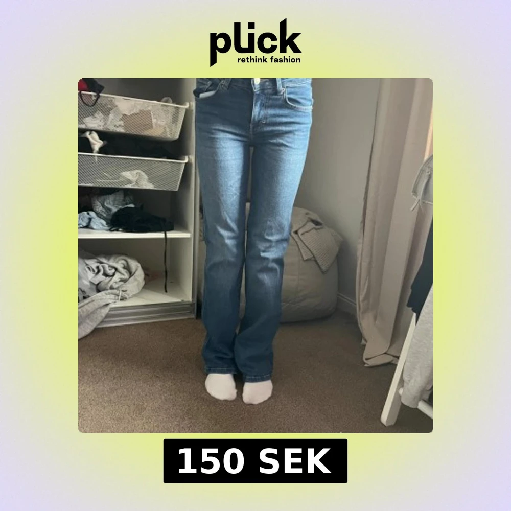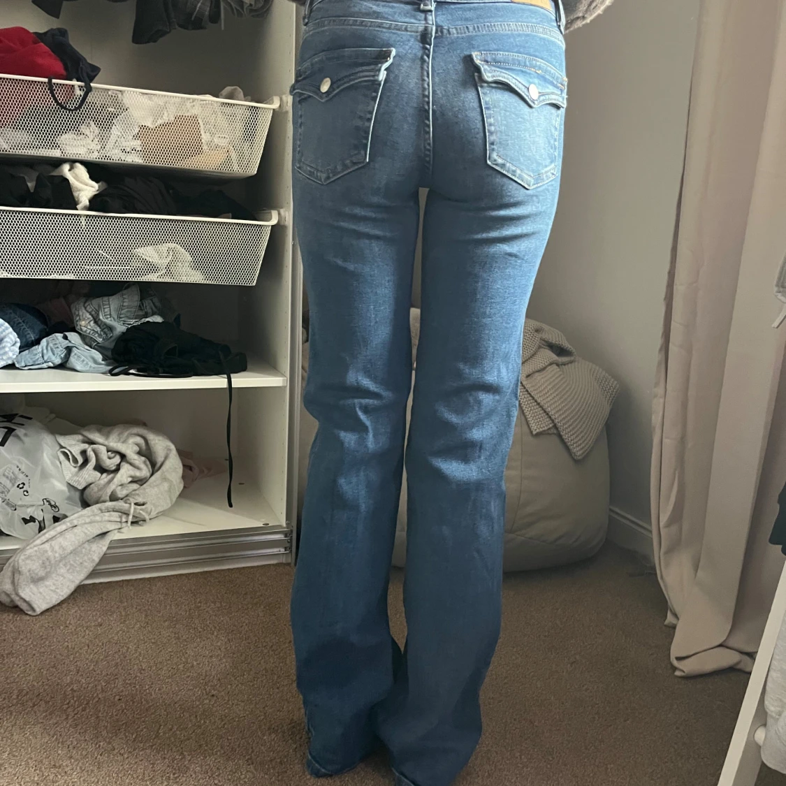 Säljer ett par klassiska blå jeans med bootcut-modell. Jeansen har snygga bakfickor med lock och silverfärgade knappar. Perfekta för dig som gillar en tidlös och trendig look. Materialet är jeans