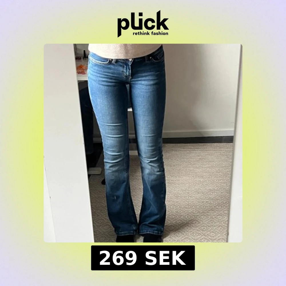 Säljer ett par klassiska blå bootcut jeans med normal passform och hög midja. Jeansen har fem fickor, dragkedja och knapp framtill. Perfekta för dig som gillar en tidlös stil med lite utsvängda ben.