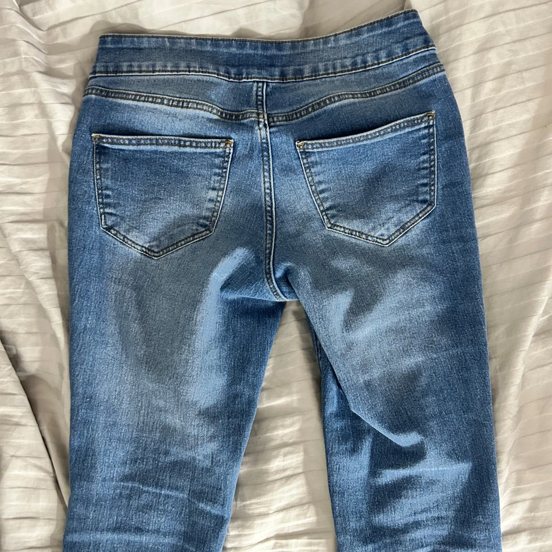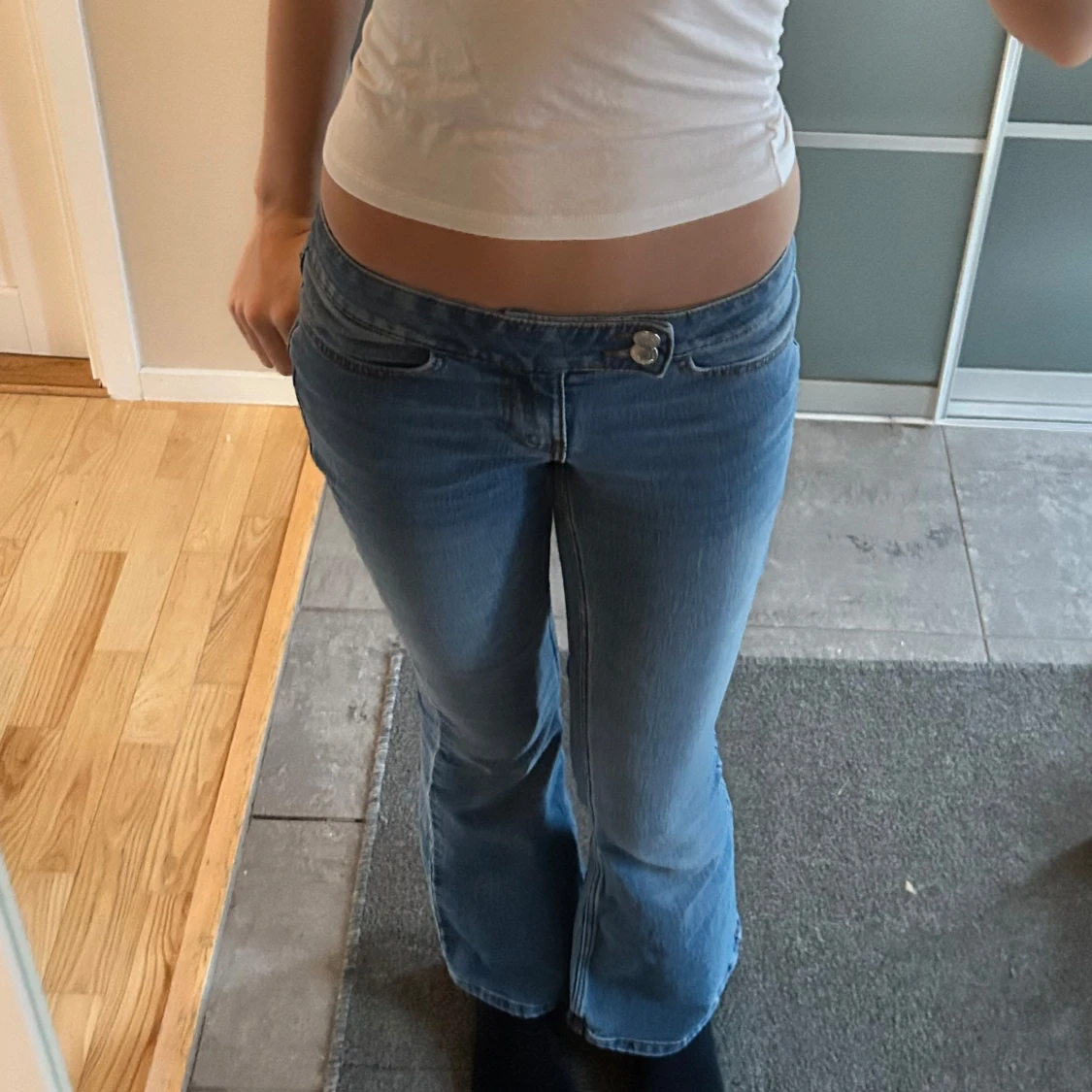 Snygga blå bootcut jeans med låg midja.