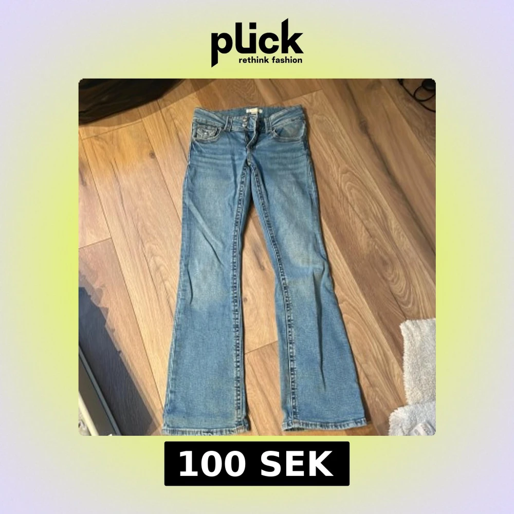 Säljer ett par klassiska blå bootcut jeans med fem fickor och normal passform. Jeansen har en lätt tvättad look och är perfekta för dig som gillar en tidlös stil. Dragkedja och knapp framtill. Passar till det mesta!