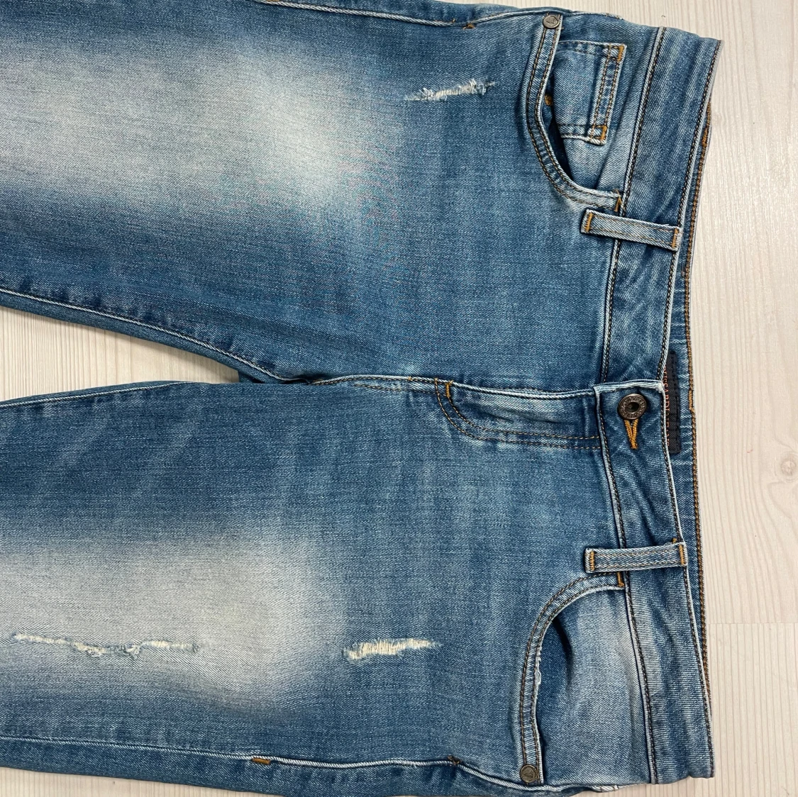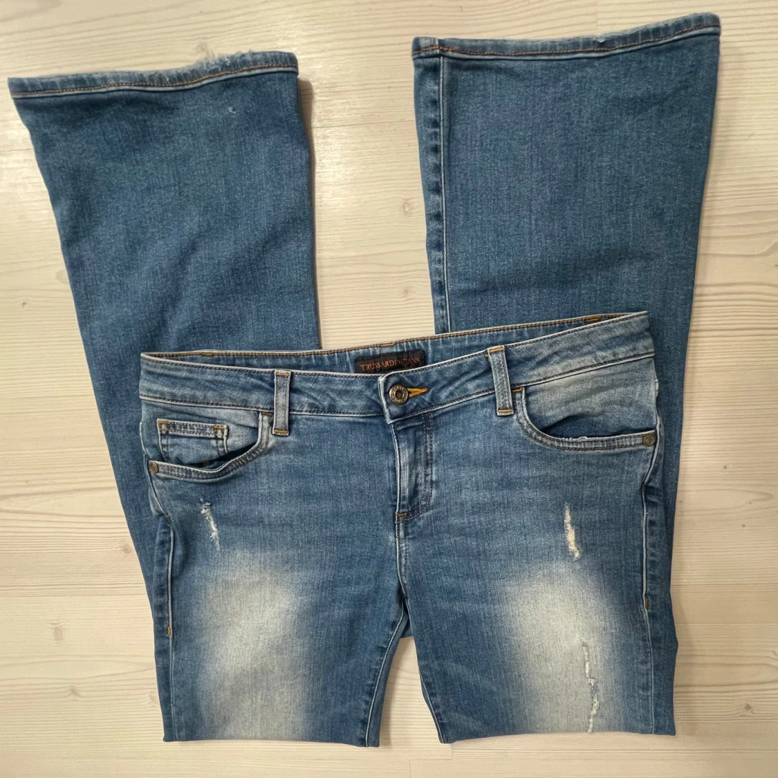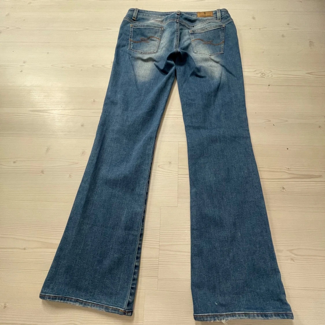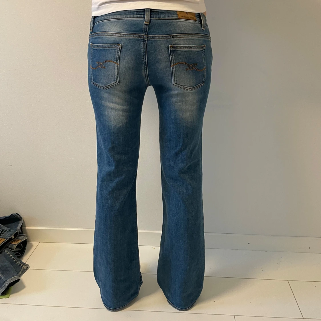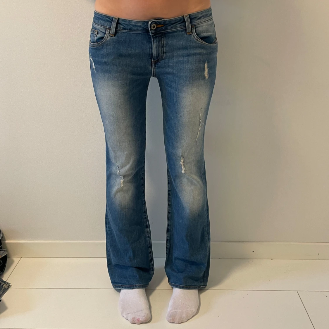 Snygga blå bootcut jeans med slitna detaljer och en klassisk femficksdesign. Midjemåttet 41, Innerbenslängd 78, grenmått 20. Jag är 167💗