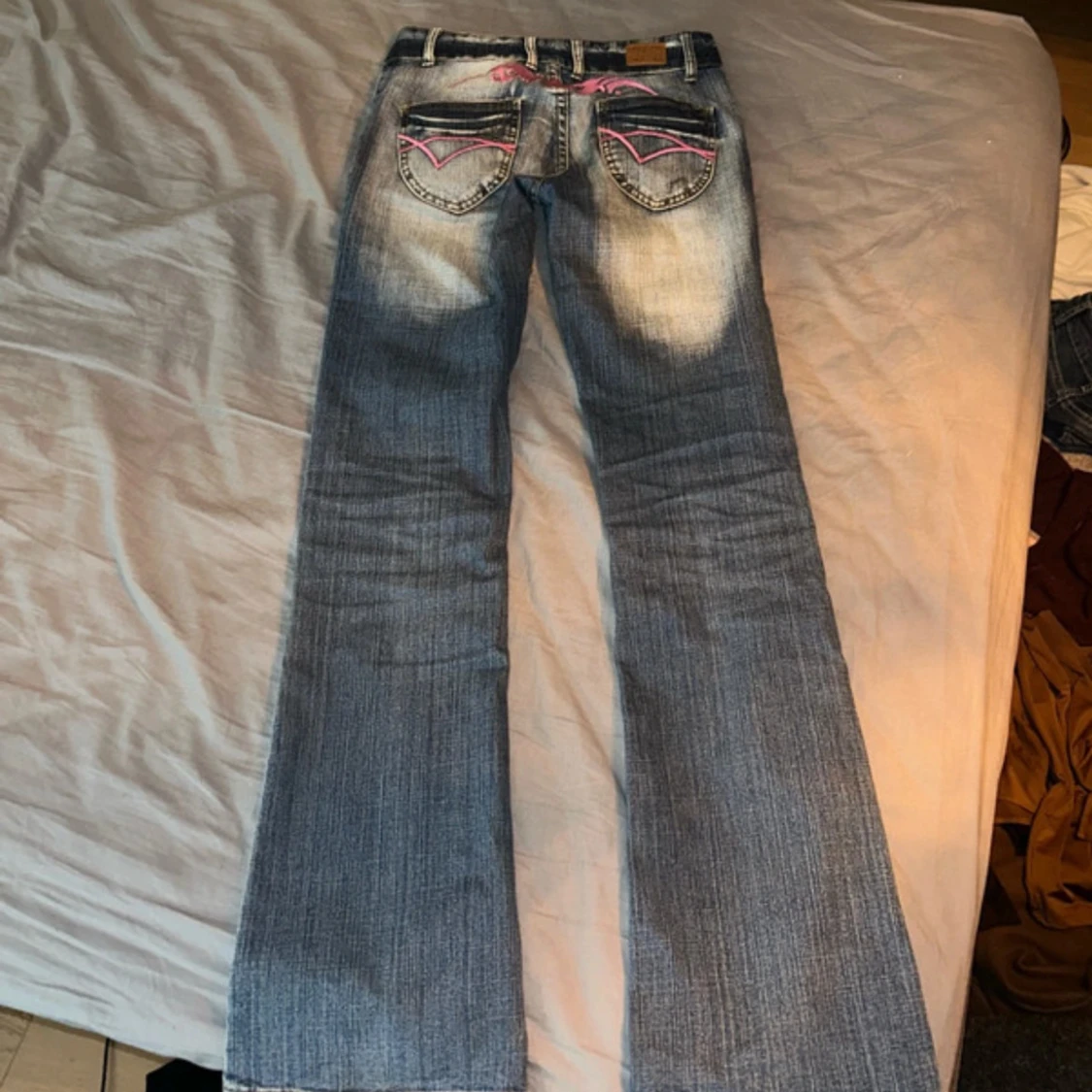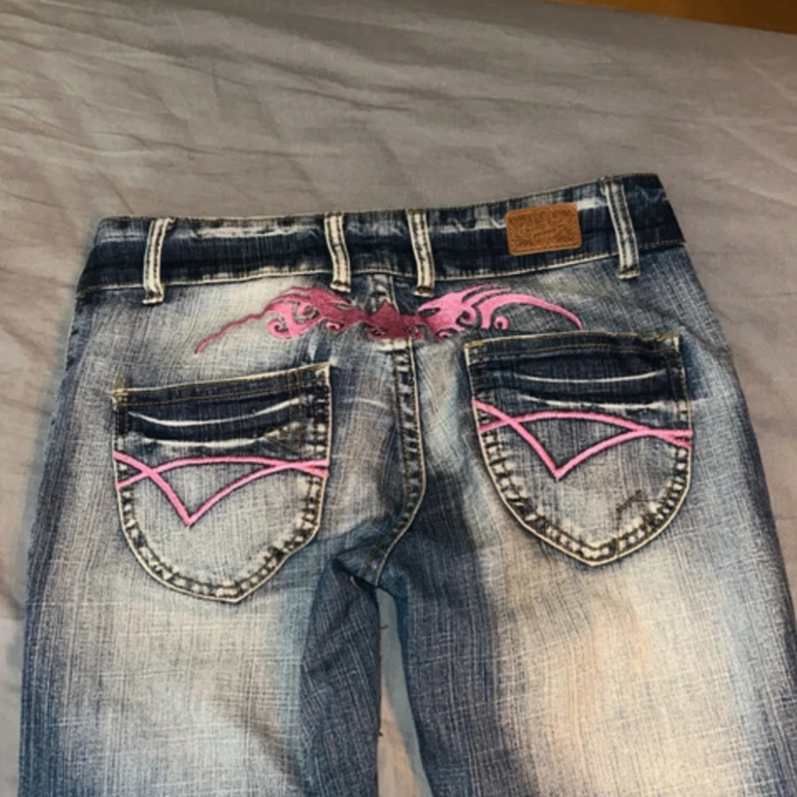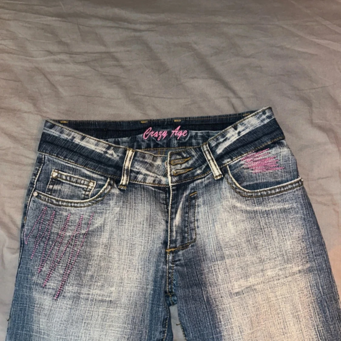 Snygga blå bootcut jeans från Crazy Age med rosa broderade detaljer på bakfickorna och framtill. Jeansen har låg midja. I storlek 26, skriv gärna för måtten💞