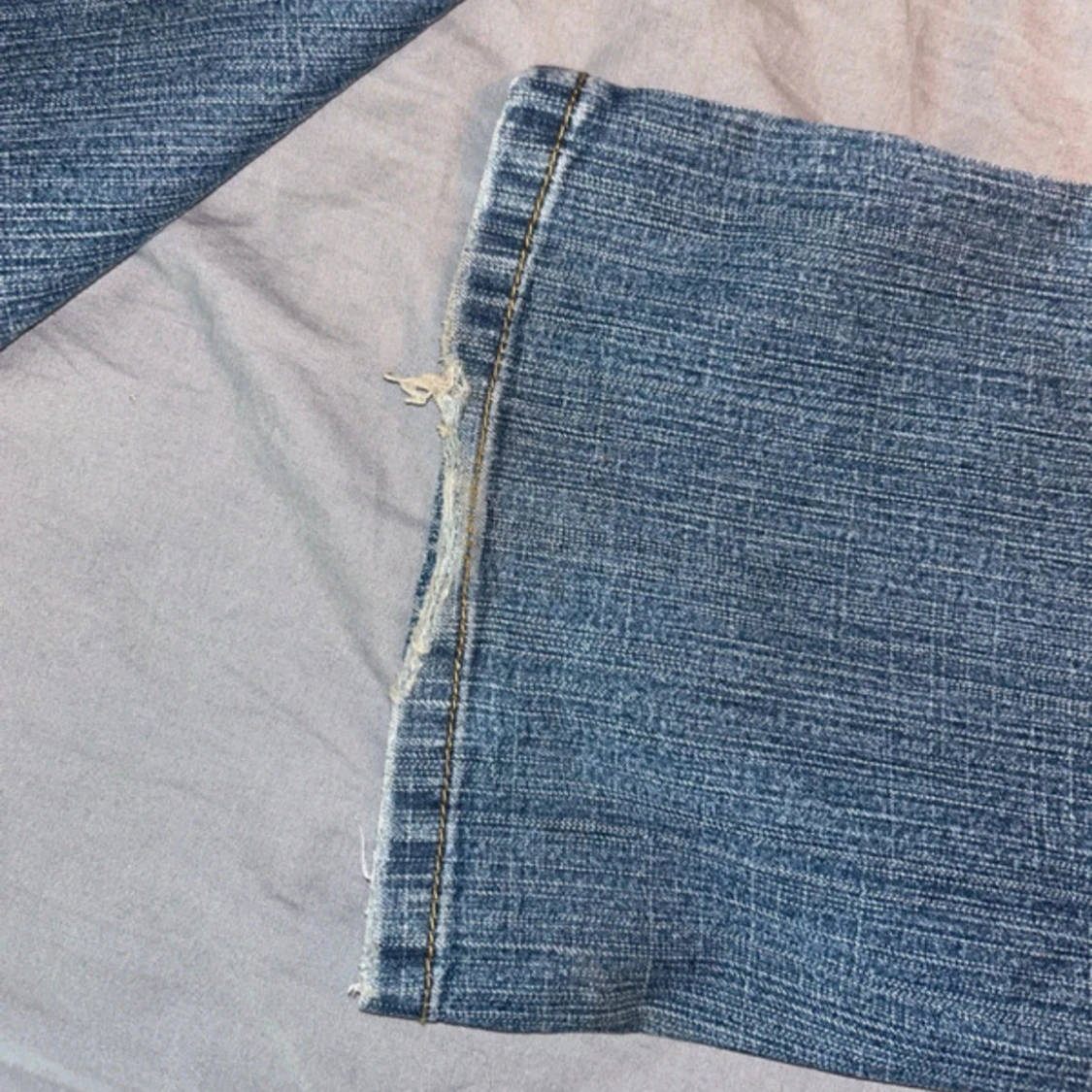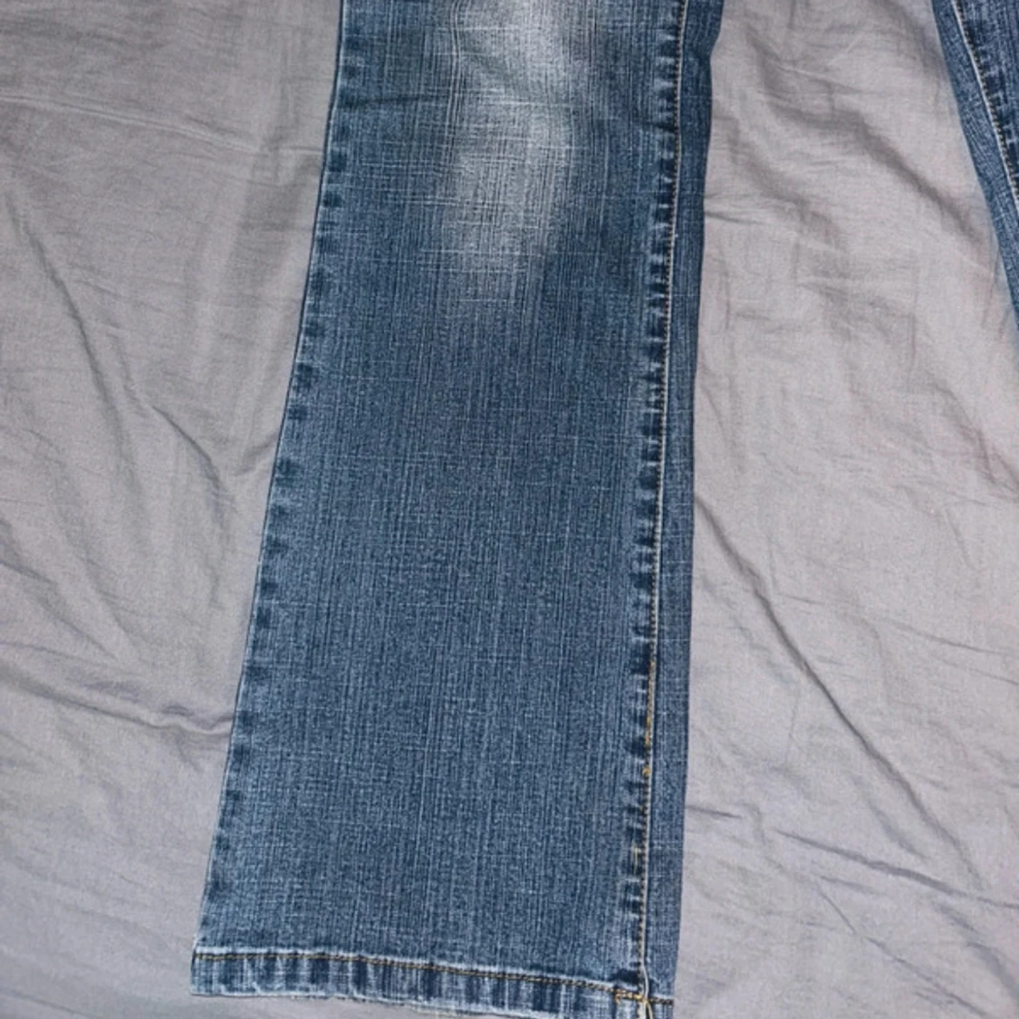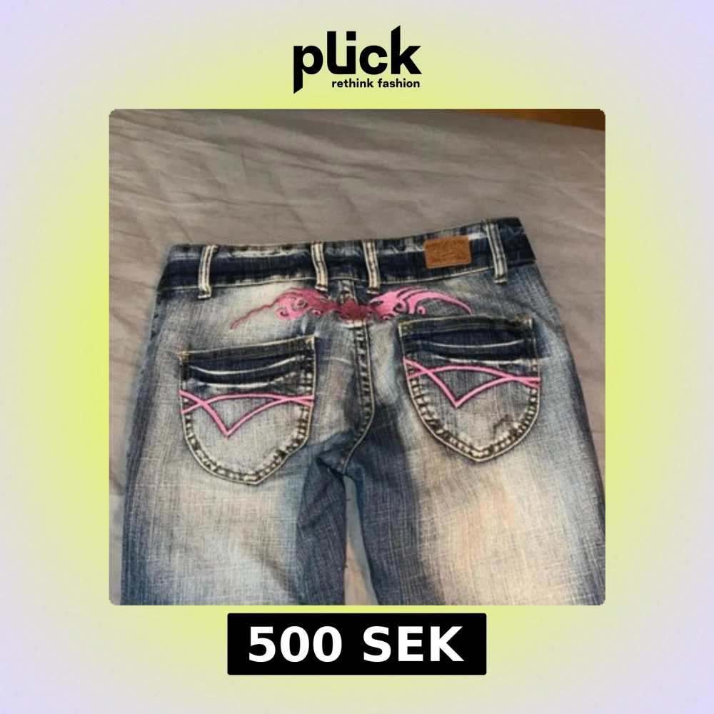Snygga blå bootcut jeans från Crazy Age med rosa broderade detaljer på bakfickorna och framtill. Jeansen har låg midja. I storlek 26, skriv gärna för måtten💞
