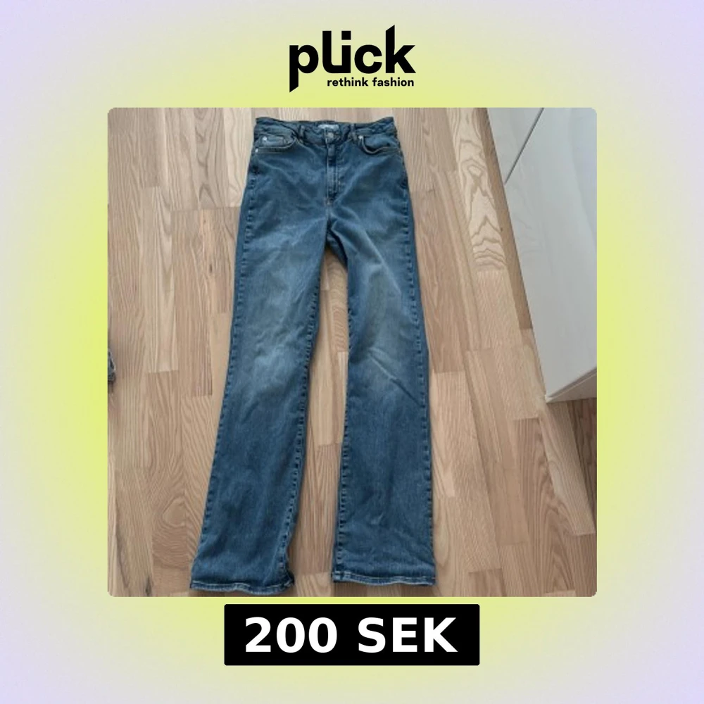 Säljer blåa högmidjade bootcut jeans från Cubus. De är ganska stretchiga och sköna. Lite slitna inuti som man ser på sista bilden men märks inte av på utsidan😊