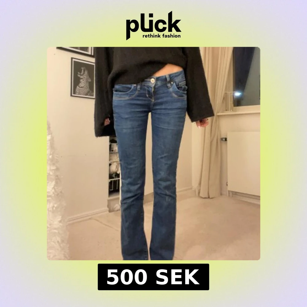 Snygga blå bootcut jeans med låg midja. Har sprättat dem vid benen så de ska bli längre men inget man tänker på. Storlek 24/30 men passar mig som är 167💕💕💕