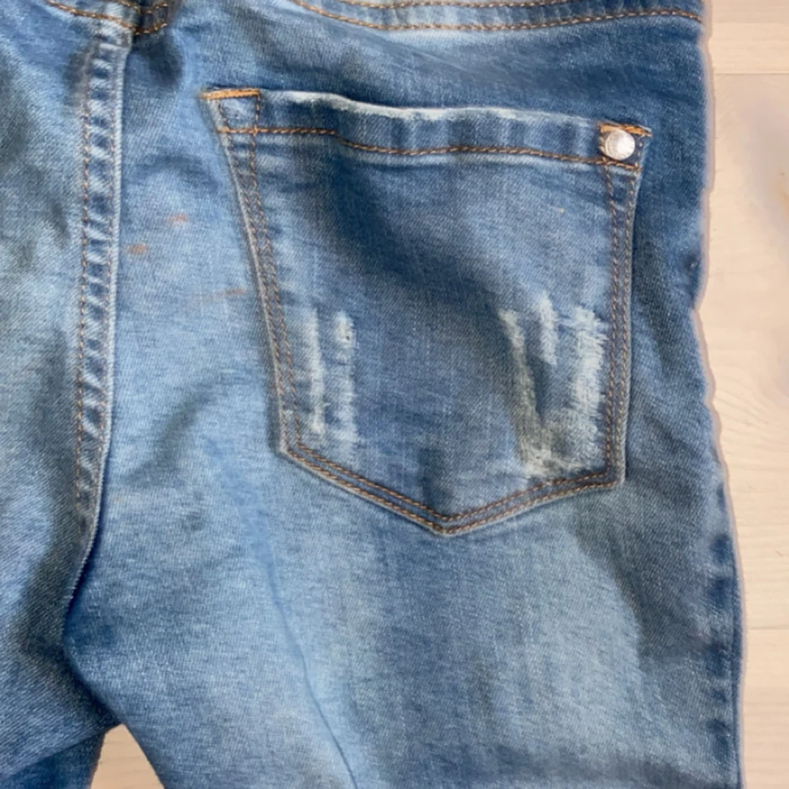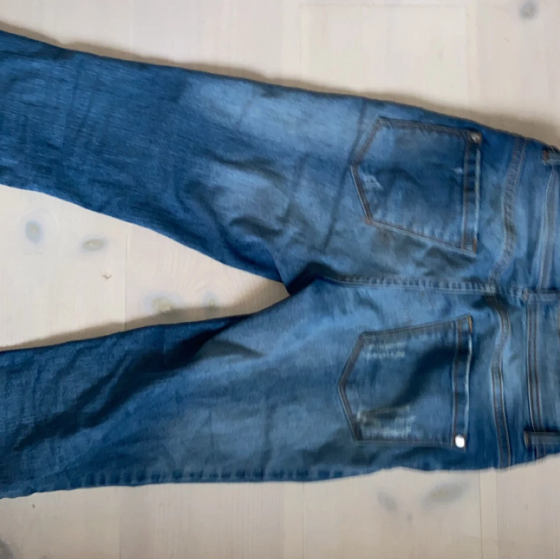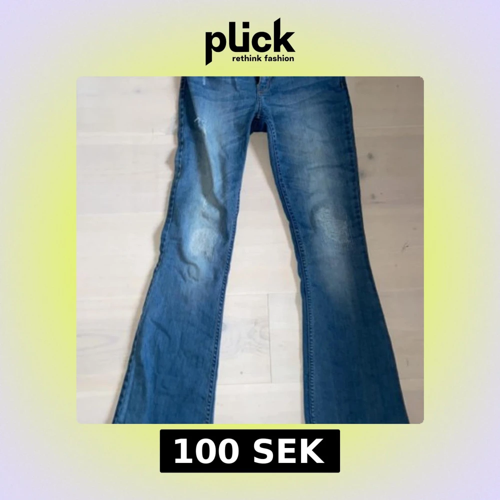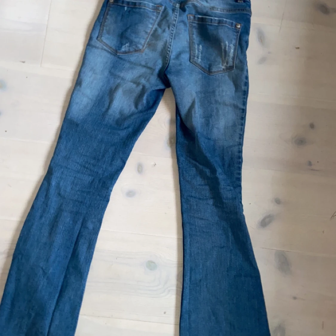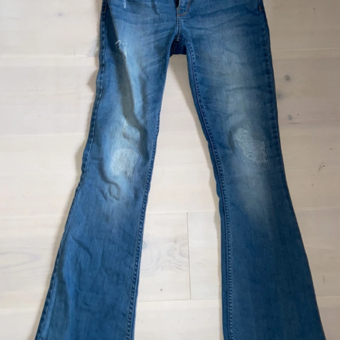 Snygga blå bootcut jeans med slitna detaljer på framsidan och bakfickor.Klassisk femficksdesign och knappgylf.