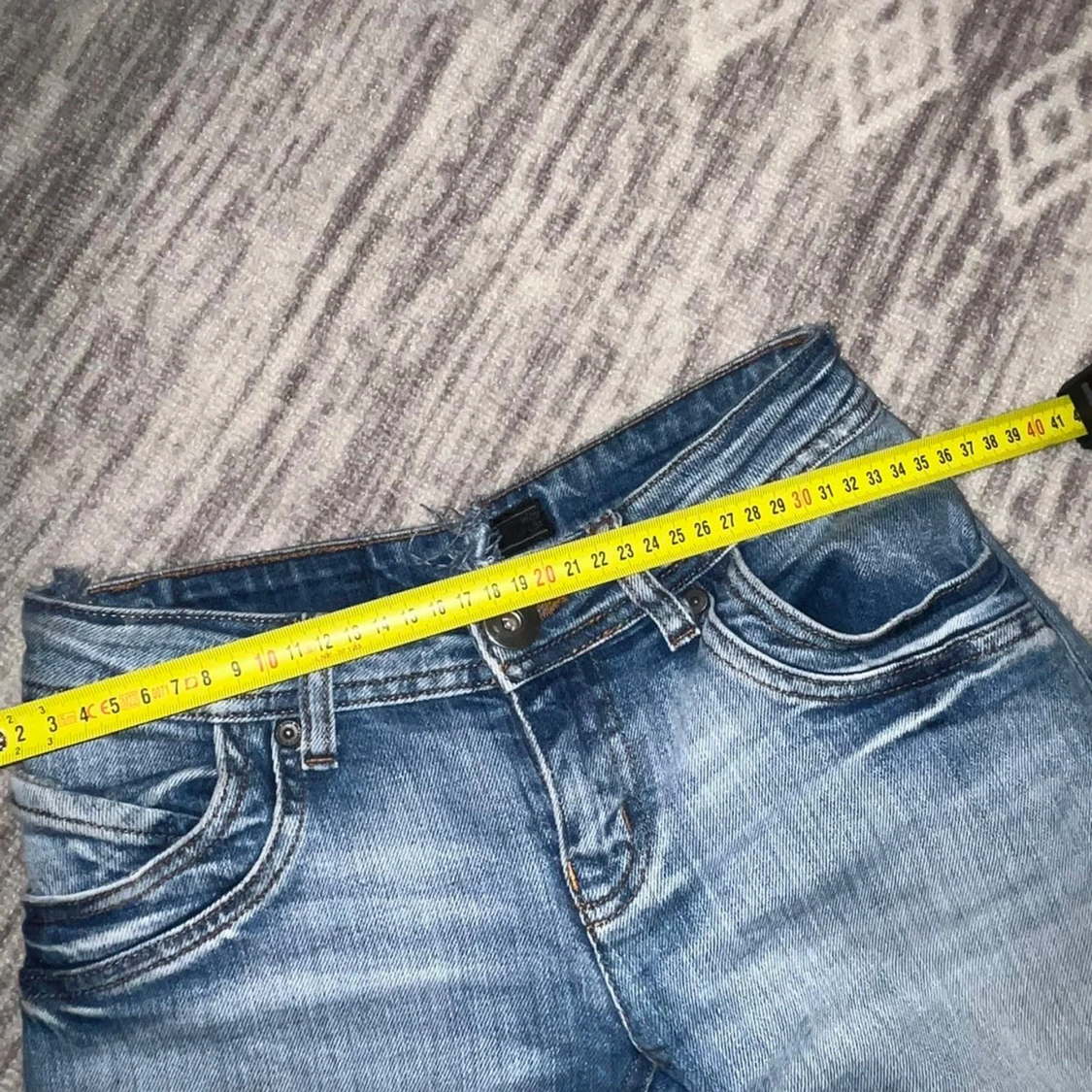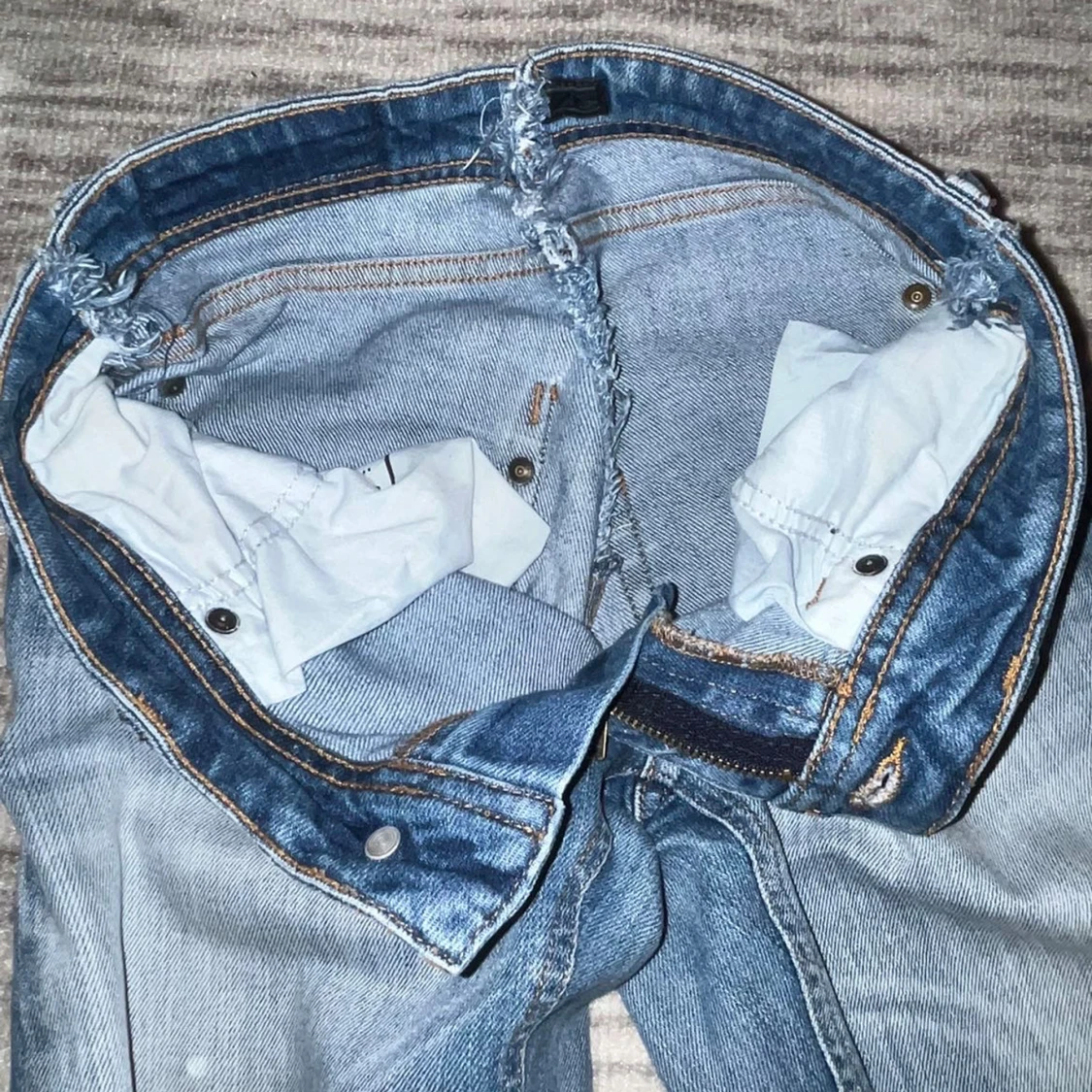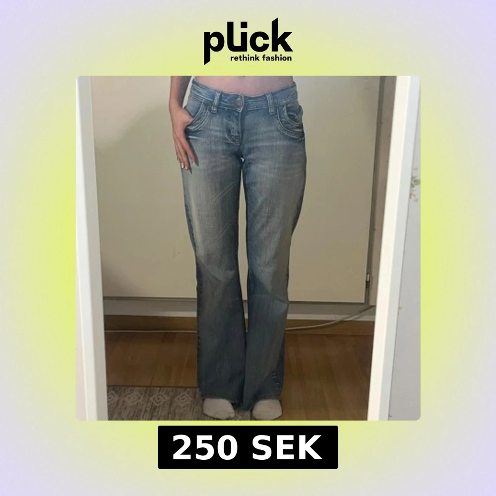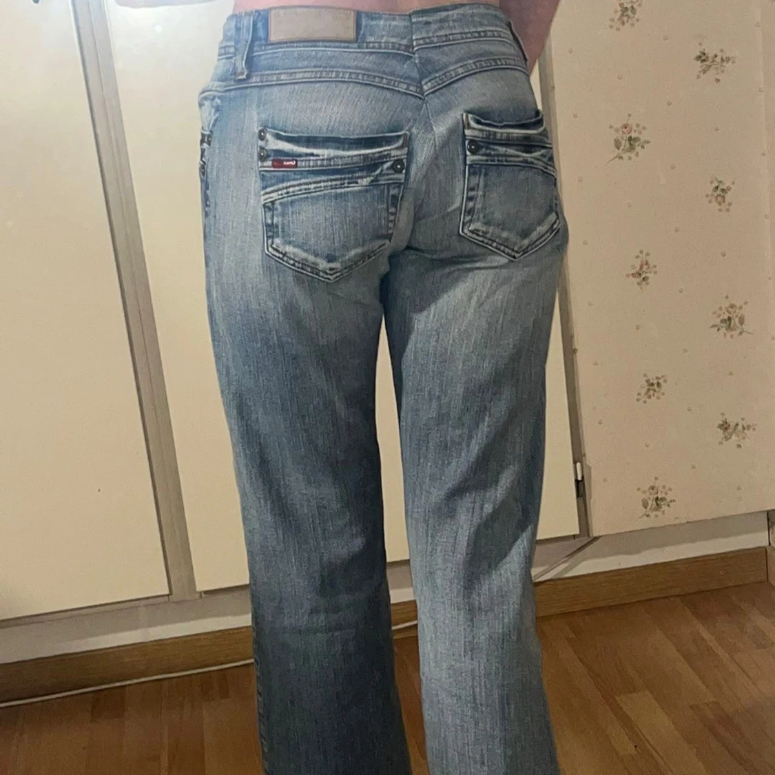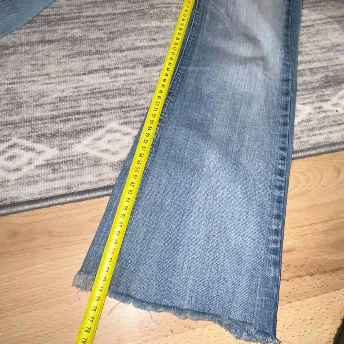Snygga blå bootcut jeans med klassisk femficksdesign och dragkedja. De har en lätt tvättad look och är perfekta för en avslappnad stil. Passar bra till både sneakers och klackar.