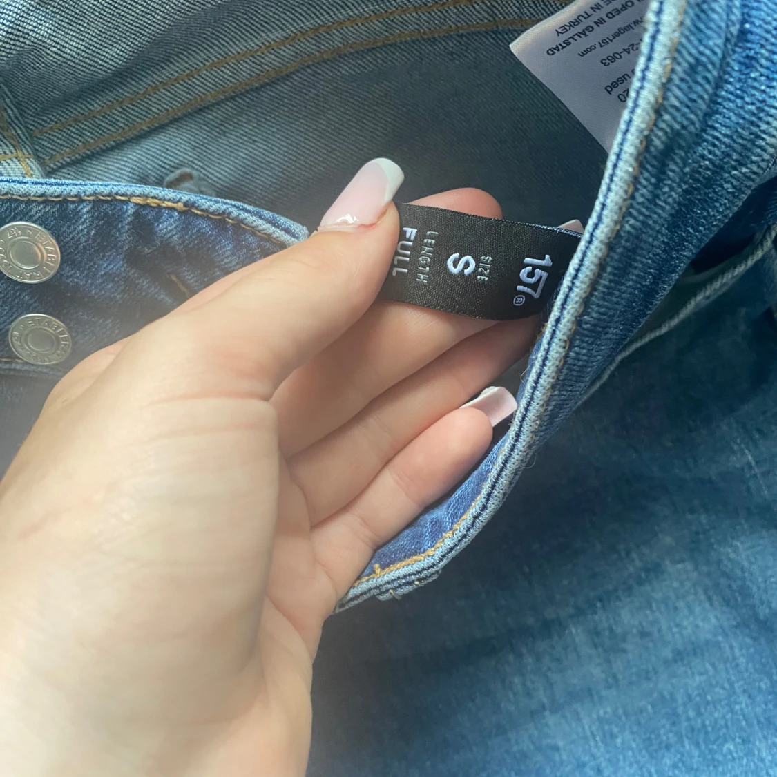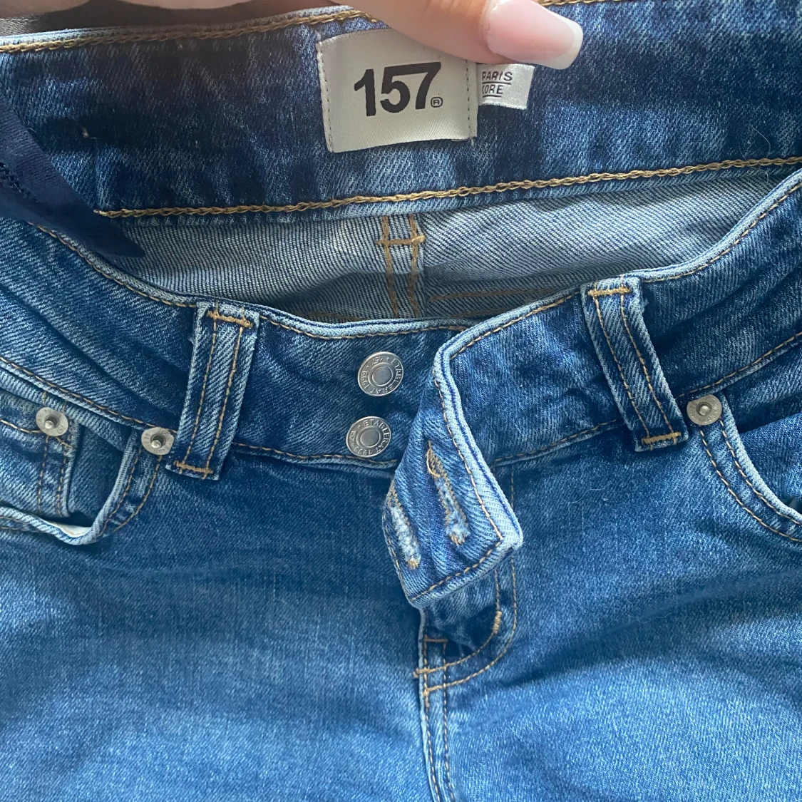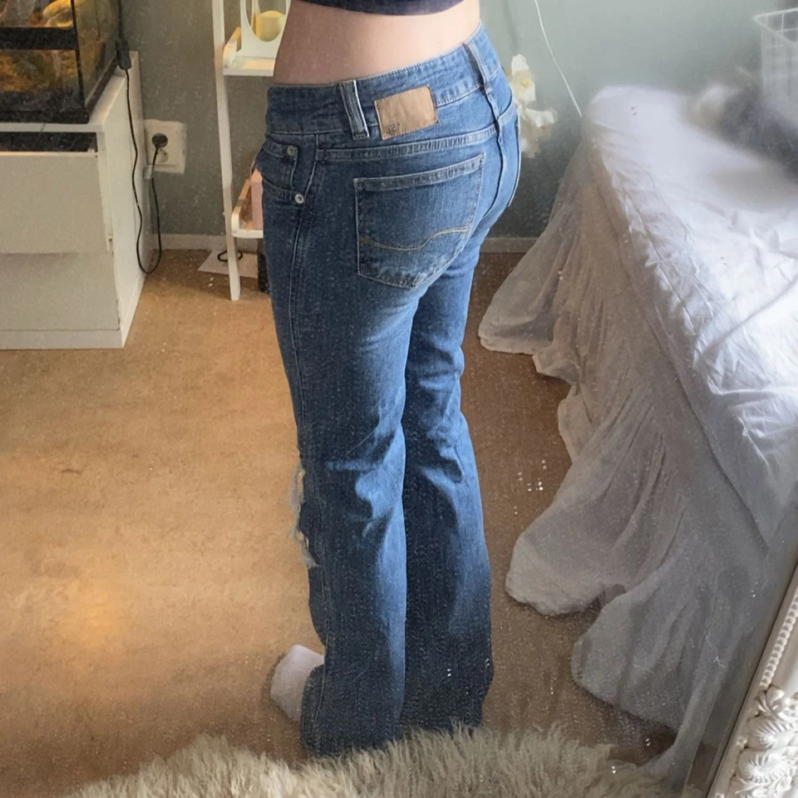 Säljer ett par blå bootcut jeans från 157 i storlek S. Jeansen har låg midja, slitna hål över knäna och klassisk femficksdesign. De är tillverkade i jeansmaterial och har dubbla knappar i midjan för extra detalj.