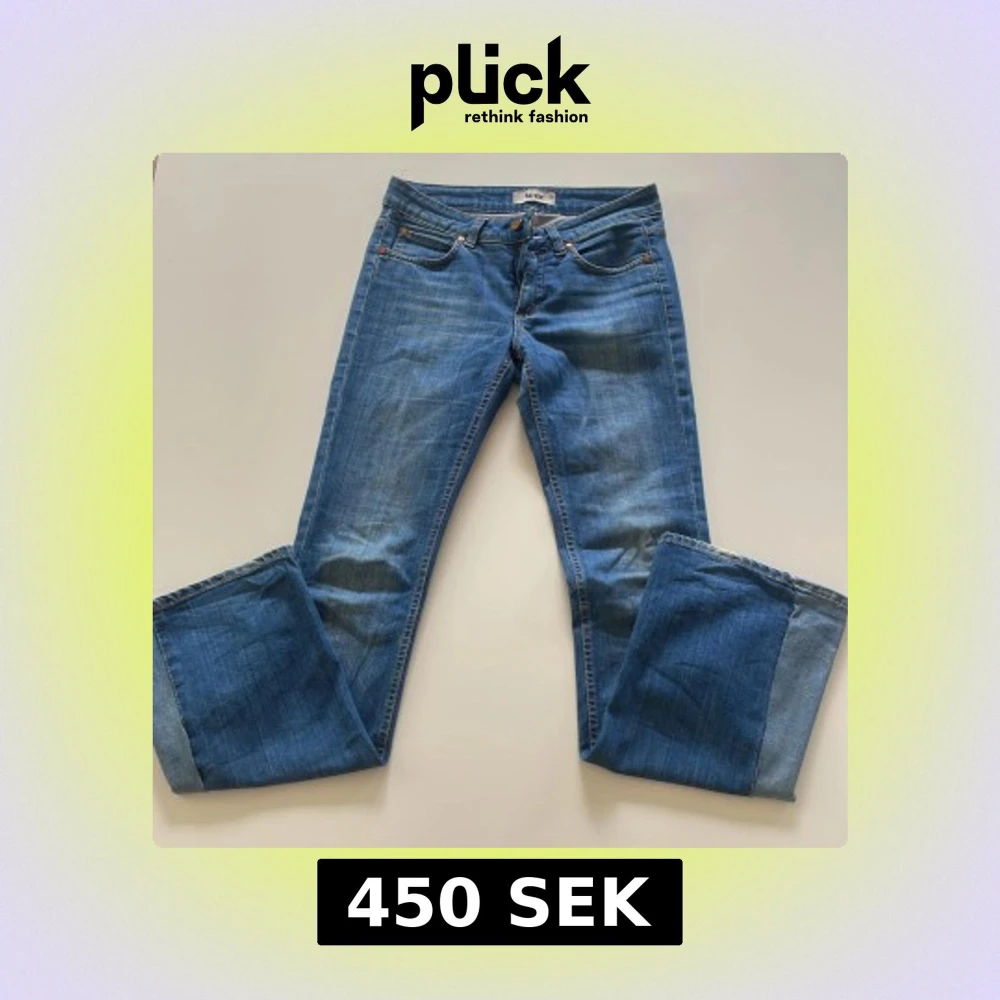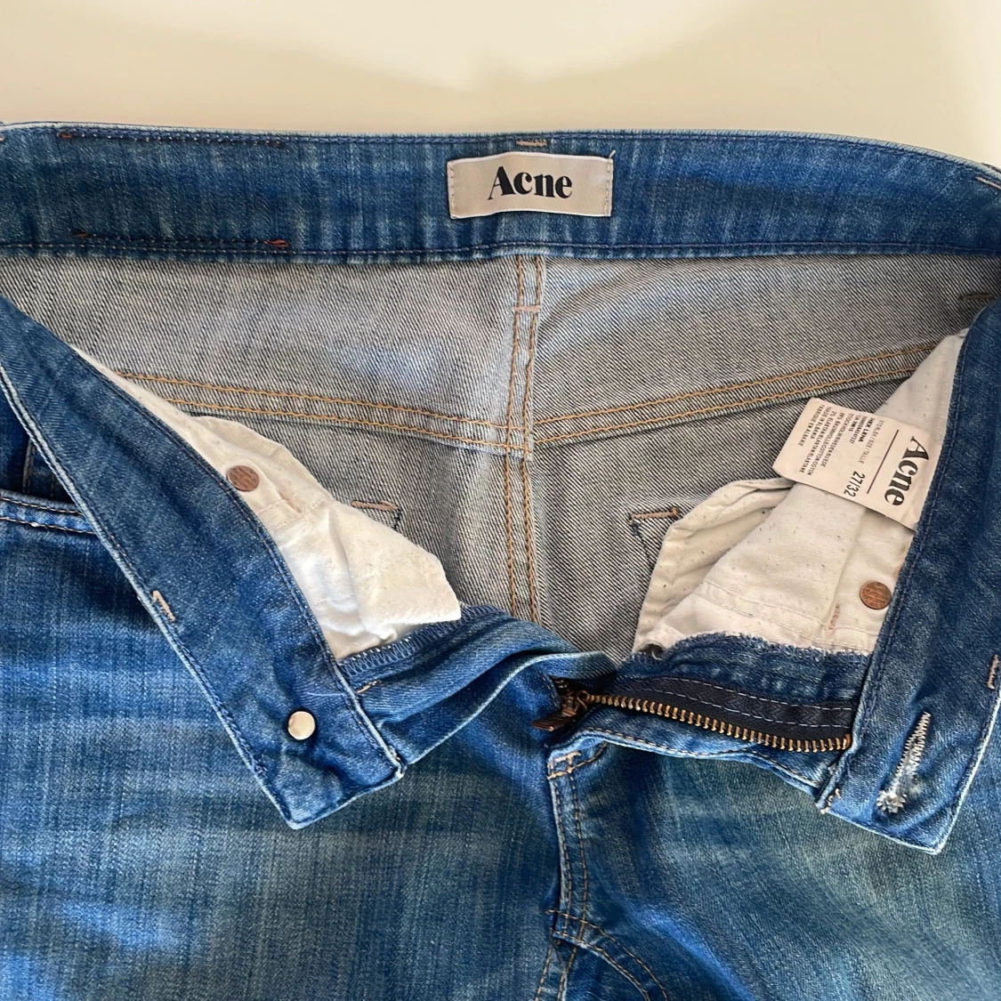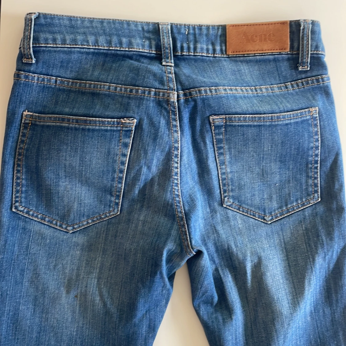 Säljer ett par klassiska blå bootcut jeans från Acne med låg midja. Jeansen har fem fickor, snygg tvätt och Acne-läderpatch bak i midjan. Perfekt passform med lite utsvängda ben. Materialet är mjukt denim i bomull.