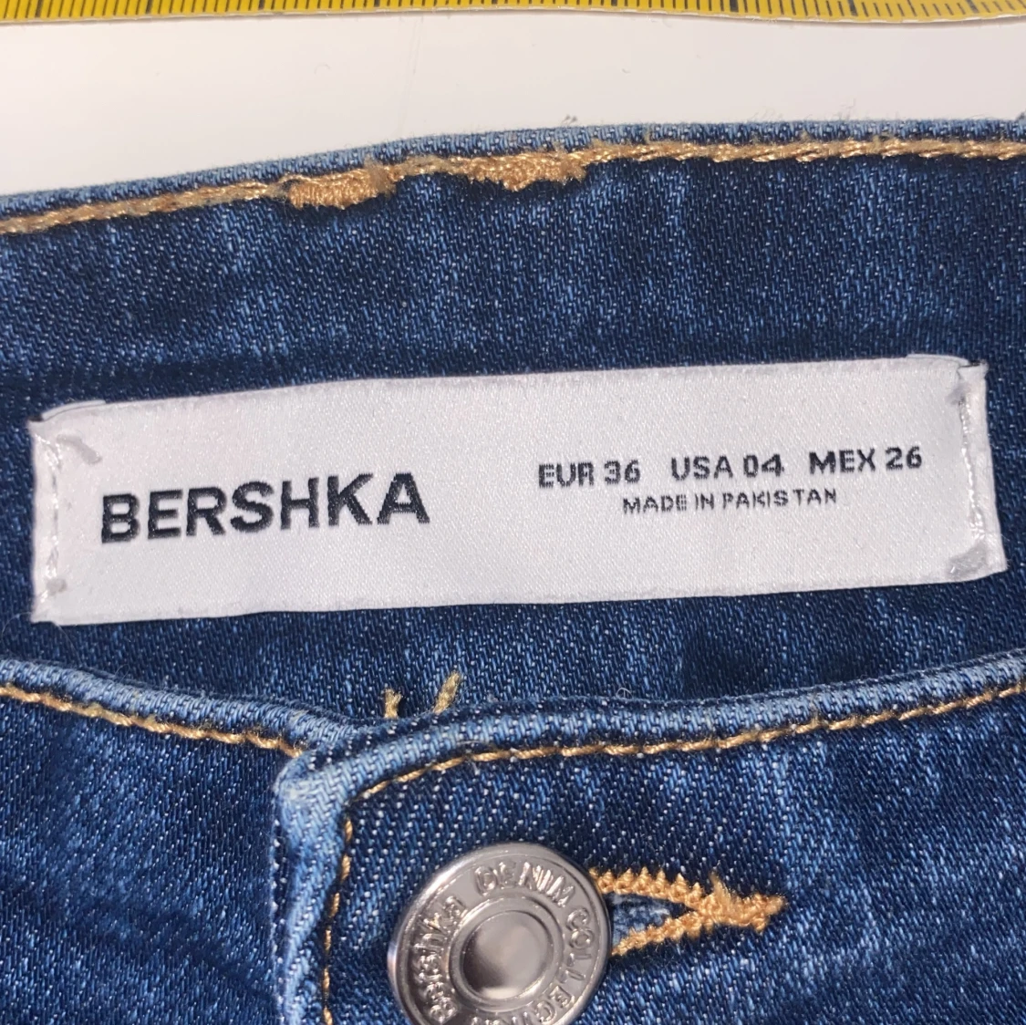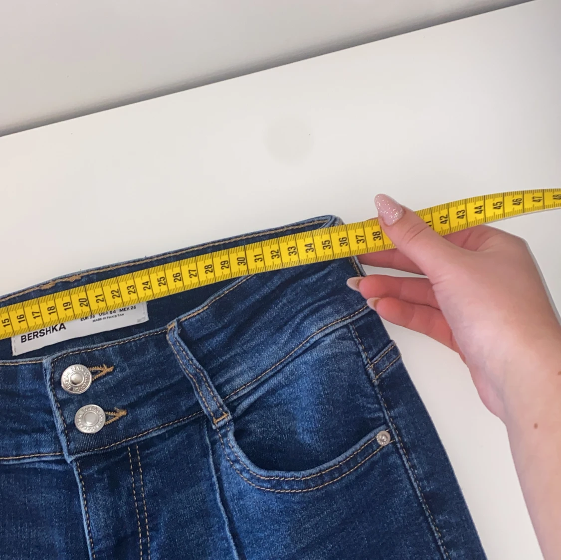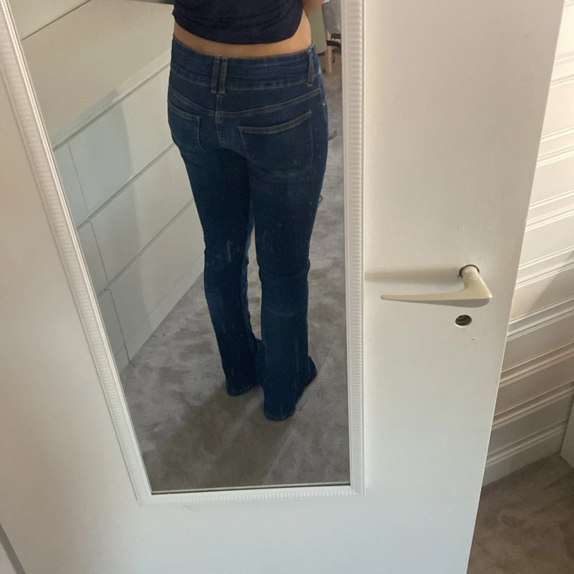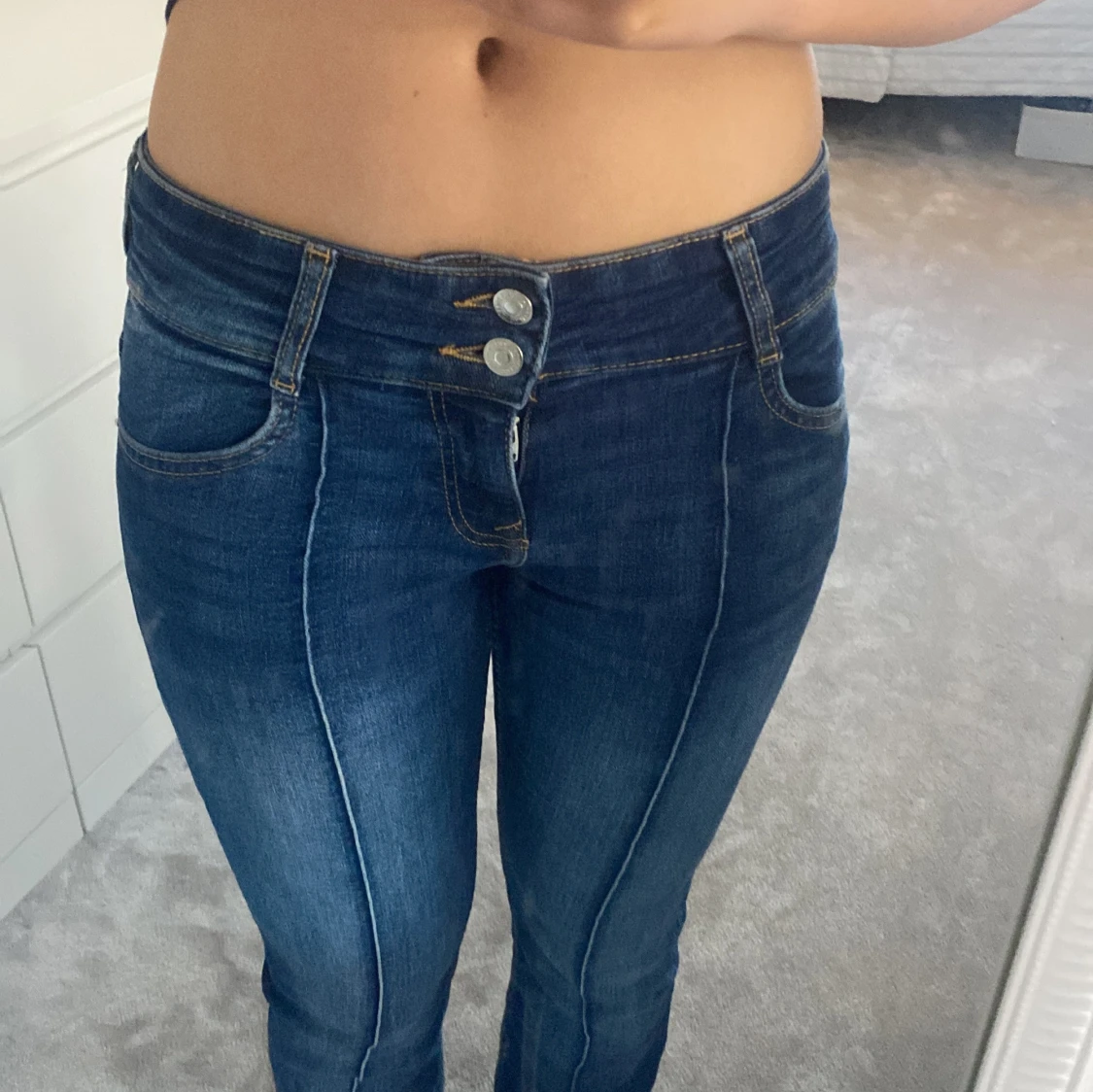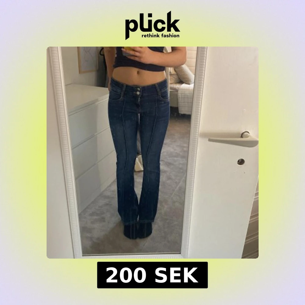 Snygga blå bootcut jeans från Bershka med dubbla knappar och dragkedja. De har en klassisk femficksdesign och är perfekta för en avslappnad stil. De är lågmidjade och har en söm i mitten.