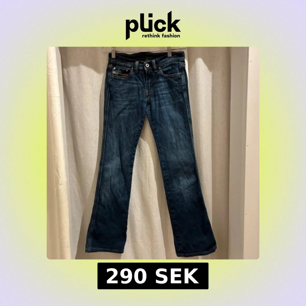 Snygga blå jeans från Diesel med klassisk bootcut passform och fem fickor. Jeansen har orange kontrastsömmar och är tillverkade i Italien. Materialet är slitstarkt. Det är ett lagat hål som ni ser på bild 4, därav priset Imnerbenslängd: 78cm