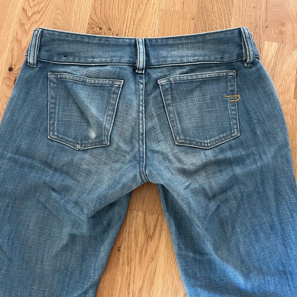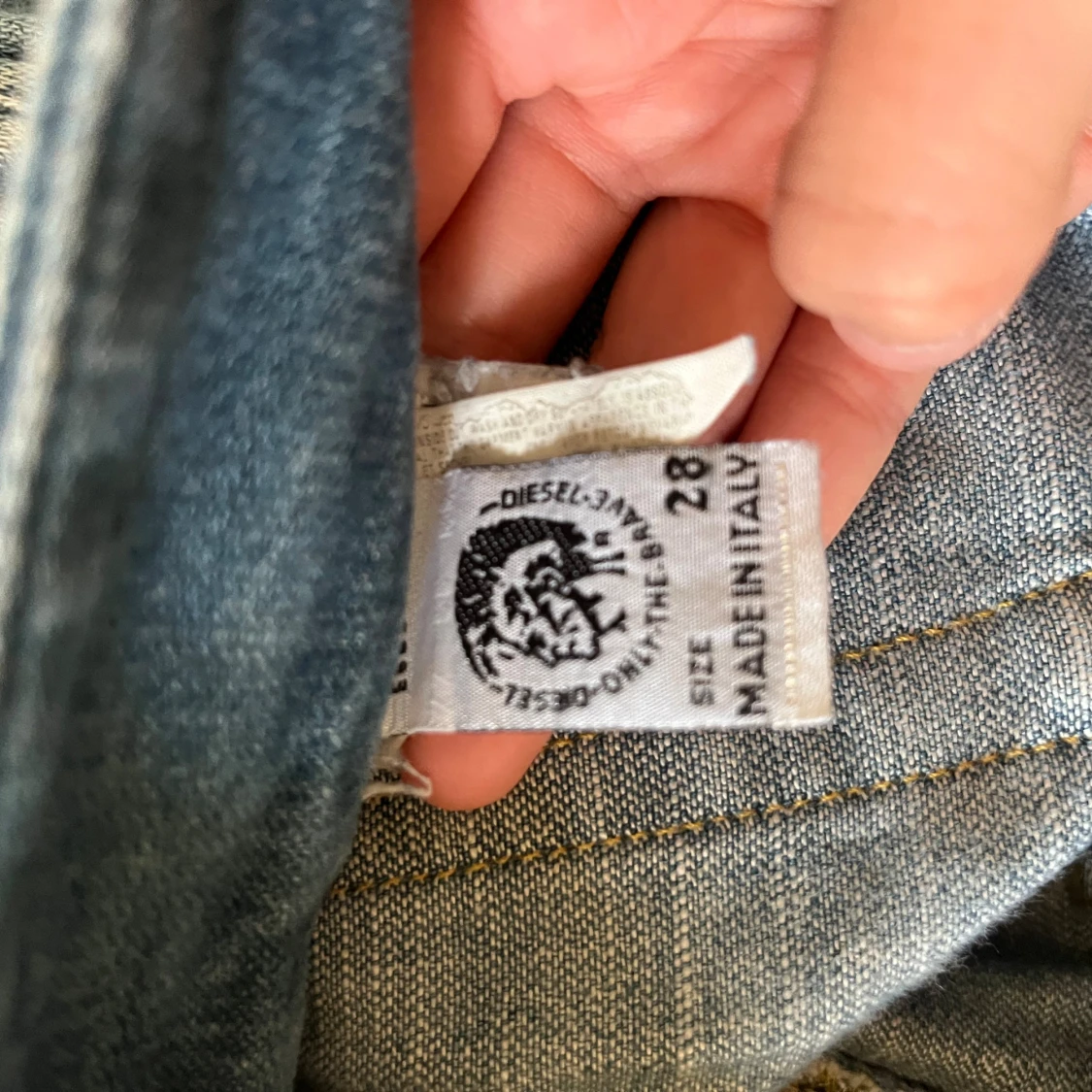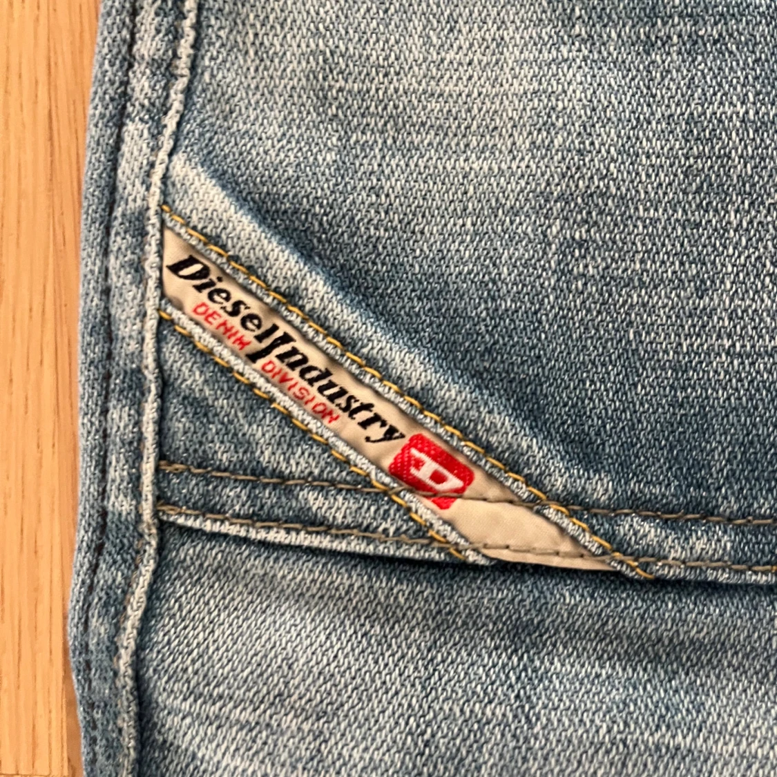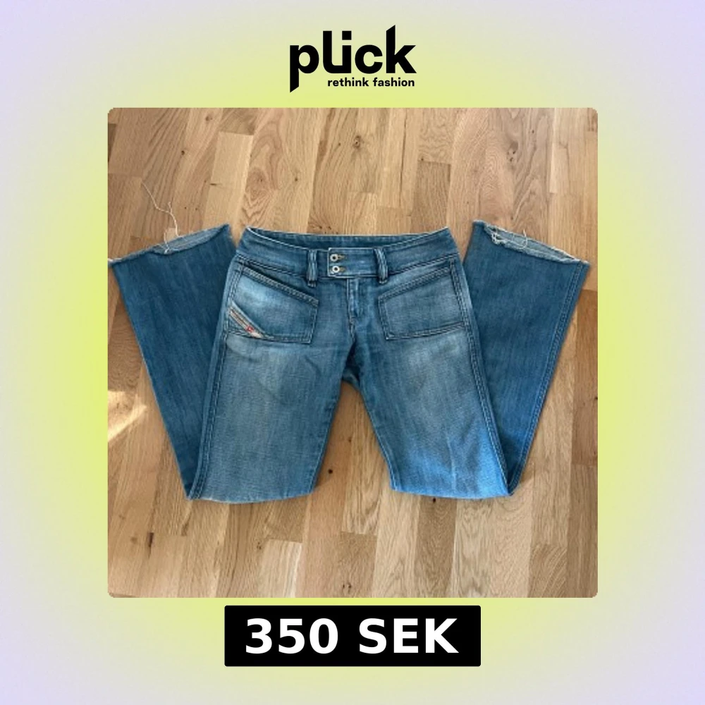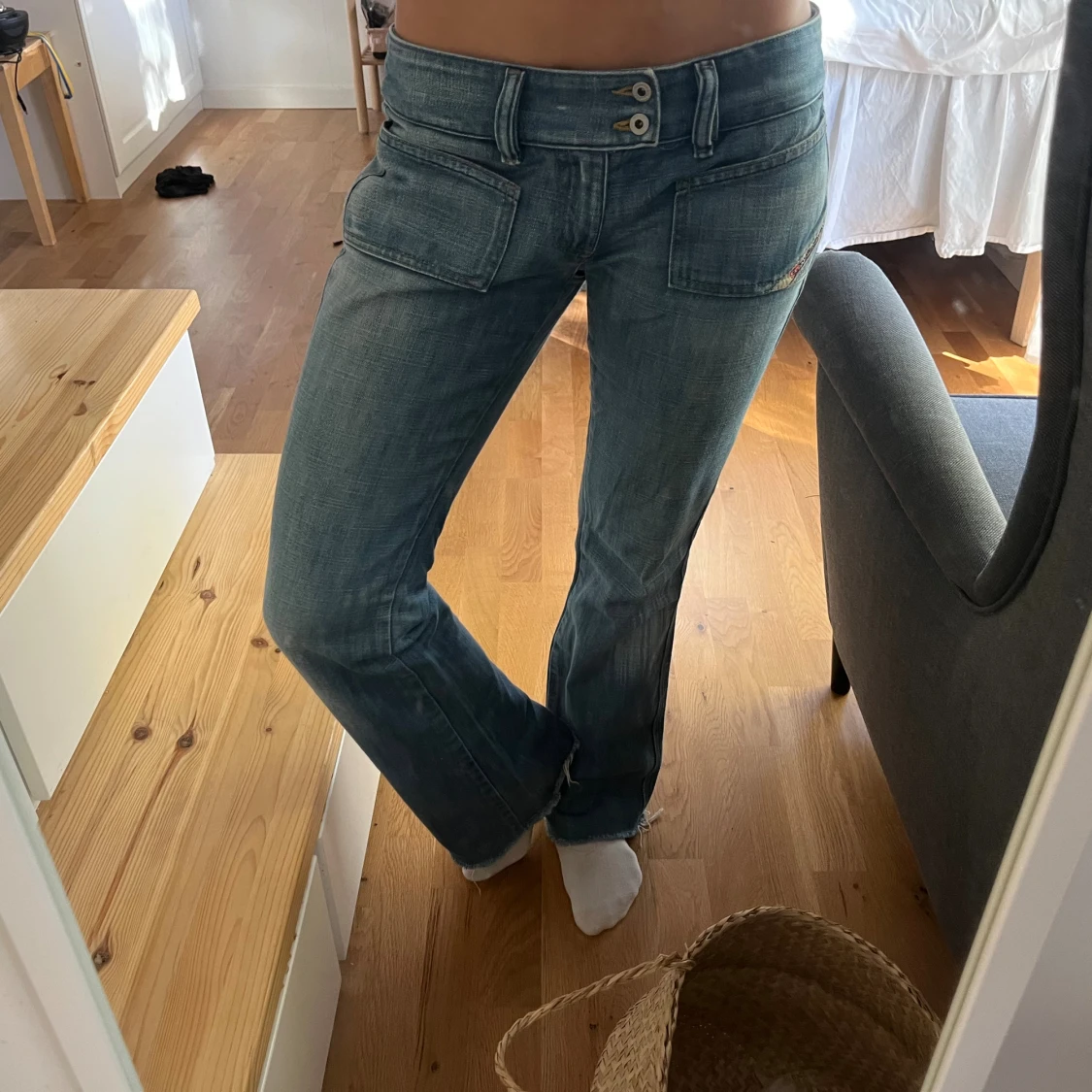 Snygga blå jeans från Diesel med bootcut passform och låg midja. Jeansen har två stora fickor fram, dubbla knappar i midjan och råa, fransiga benslut. Midjemåttet: 38cm Innerbenslängd: 76cm