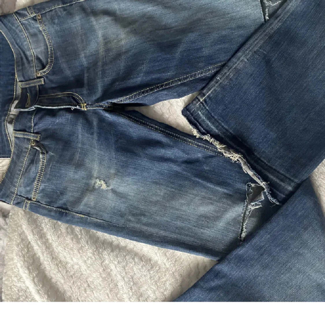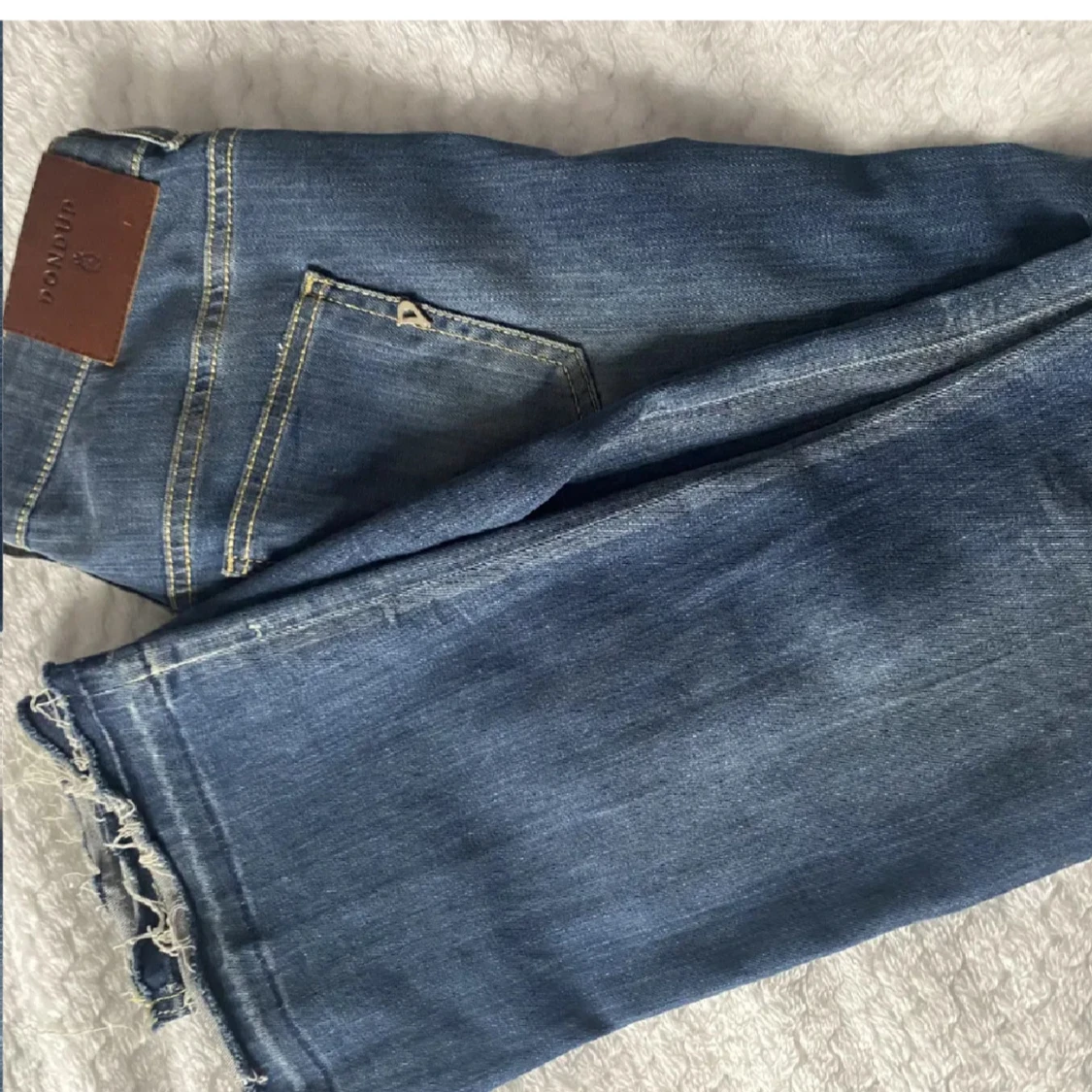 Snygga blå bootcut jeans från Dondup med slitningar och hål på knät. Låg midja och klassisk femficksmodell. Jeansen har fransade benslut och är tillverkade i mjukt denimtyg. Perfekta för dig som gillar en avslappnad och trendig look.