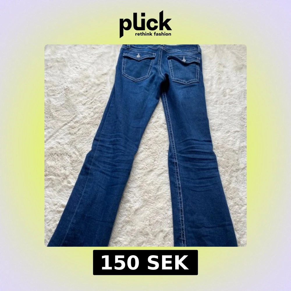 Snygga blå jeans från Gina Tricot i modell bootcut med kontrastsömmar och fickor med lock och knapp bak. Klassisk femficksdesign och normal passform. Perfekta för dig som gillar en tidlös jeanslook med lite utsvängda ben.