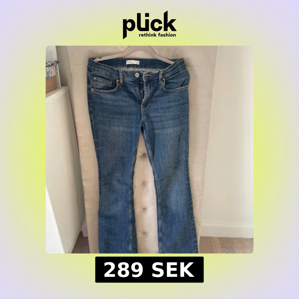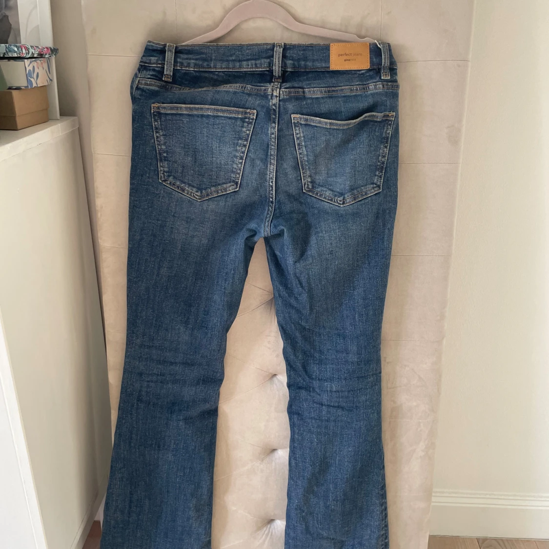 Snygga blå jeans från Gina Tricot med klassisk bootcut-modell. Jeansen har fem fickor, normal midja och är tillverkade i ett mjukt denimtyg av bomull. Perfekt för dig som gillar en tidlös och avslappnad stil. Lite slitna längst ner